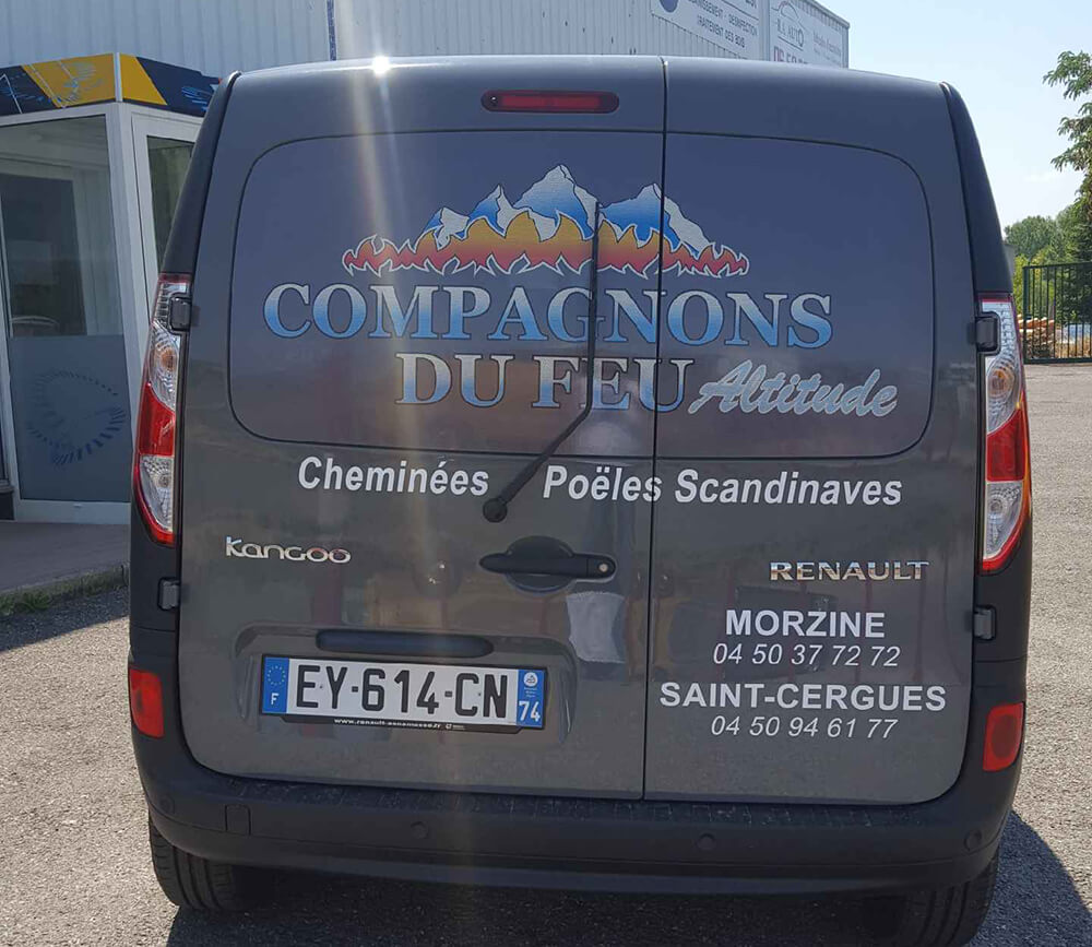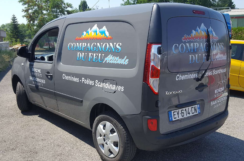 Réalisation d’un covering partiel pour une société spécialisée dans la vente de cheminées et poële. Ce décor a été décliné sur toute la flotte de véhicules de l’entreprise. Décor réalisé par nos soins.