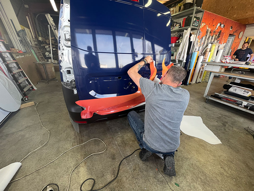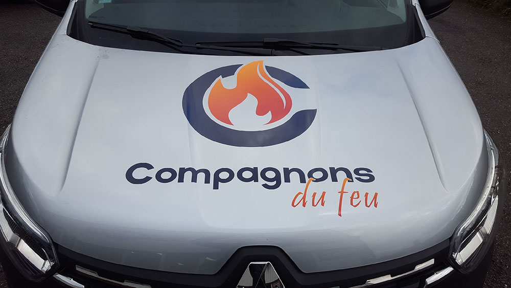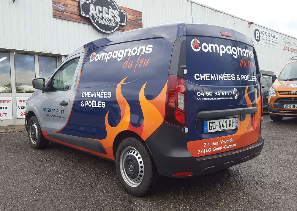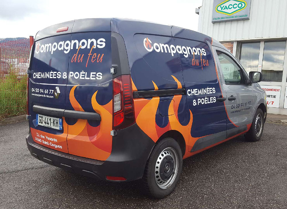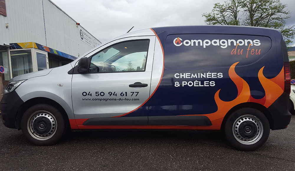 Réalisation d’un covering partiel sur le nouveau véhicule des compagnons du feu, votre spécialiste de la cheminée et des poêles à bois sur Saint-Cergues & Morzine. Décor réalisé par notre partenaire graphique OAK-Webdesign.