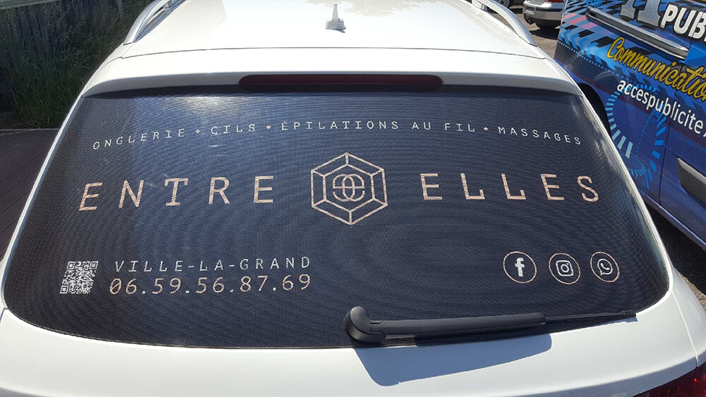 Personnalisation d’une lunette arrière en adhésif micro-perforé pour un institut de beauté installé à Ville-la-Grand. Décor fourni par le client.