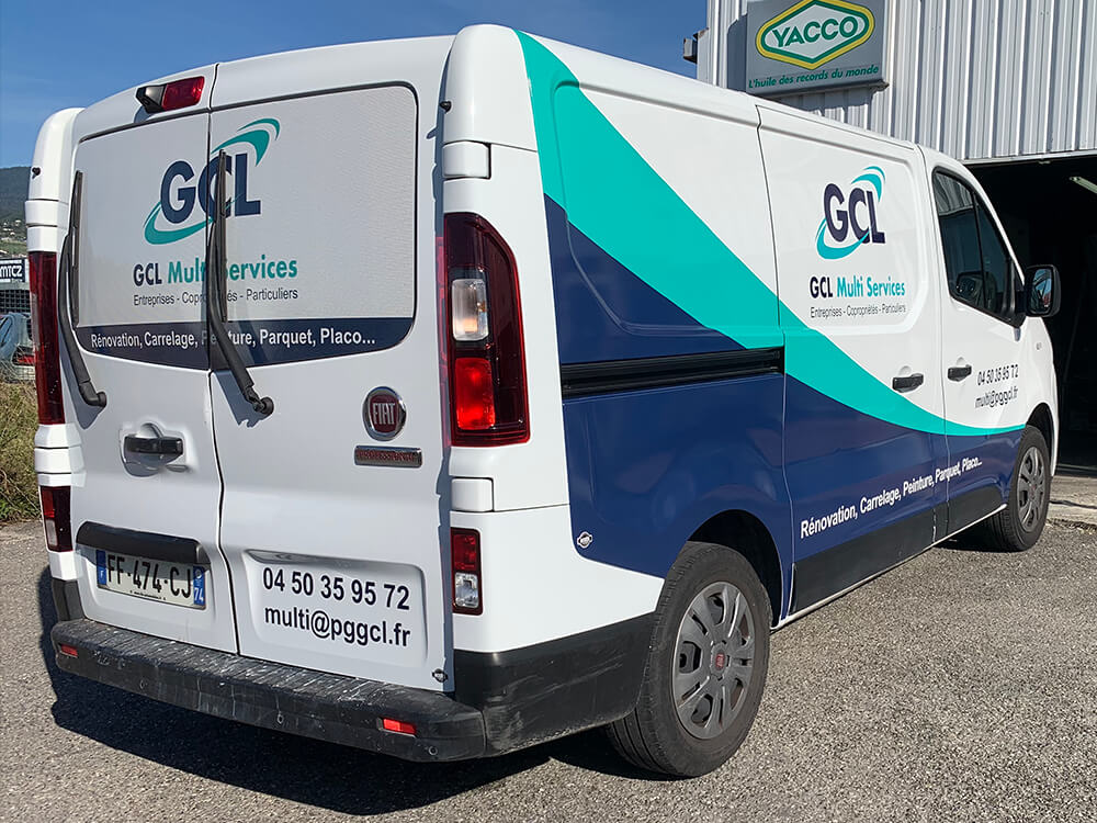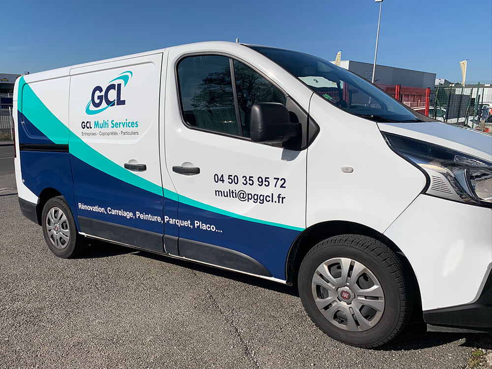 Réalisation d’un covering partiel sur les véhicules de cette entreprise de Saint-Cergues, spécialisée dans tous les travaux de la maison. Décor réalisé par notre partenaire graphique OAK-Webdesign.