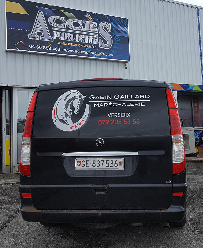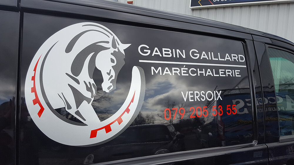 Réalisation d’un covering partiel pour un maréchal ferrant exerçant sur Suisse. Décor réalisé par nos soins.