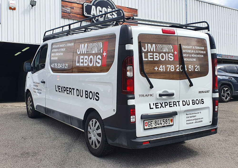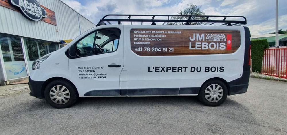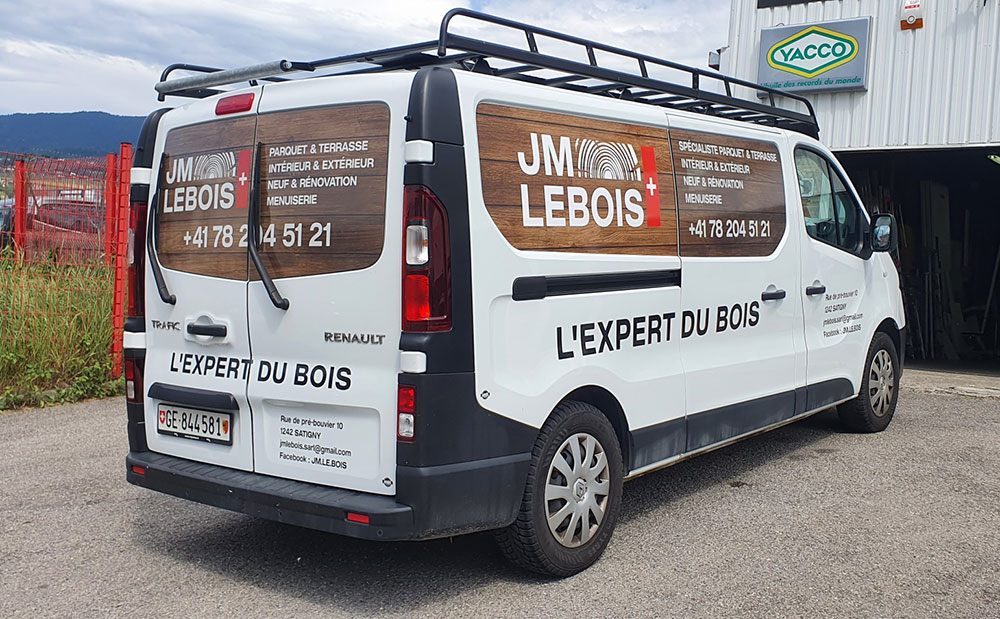 Réalisation d’un covering partiel sur le véhicule d’un menuisier Suisse qui intervient sur tout le bassin Genevois. Décor fourni par le client.