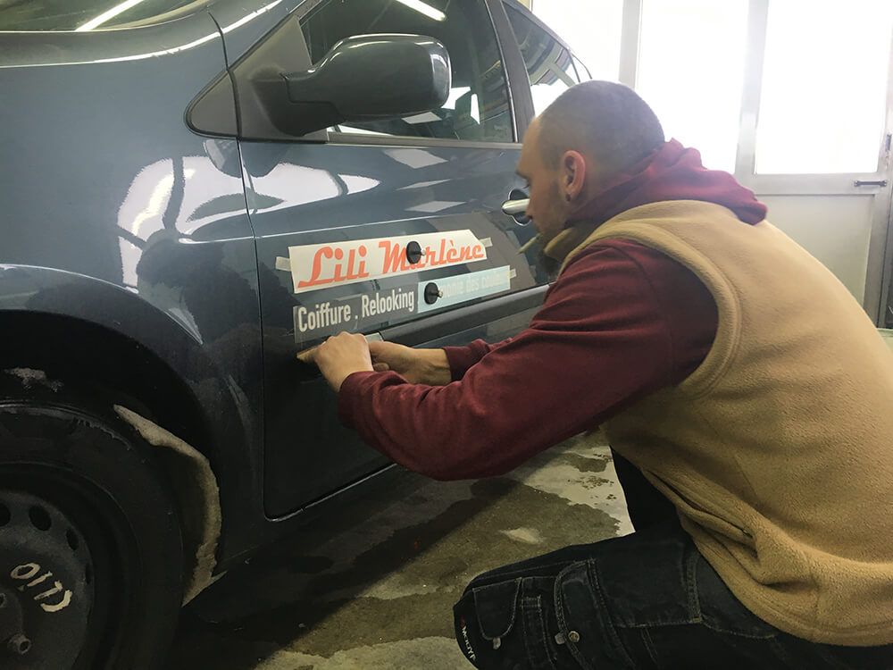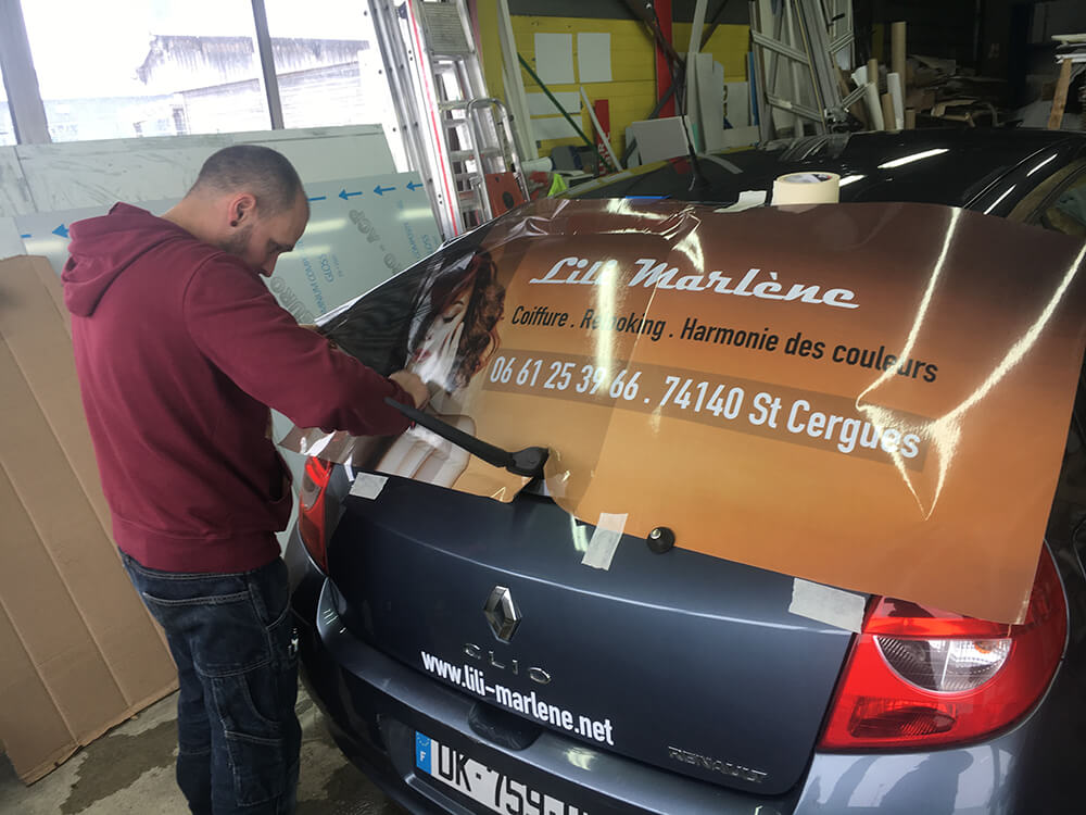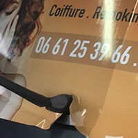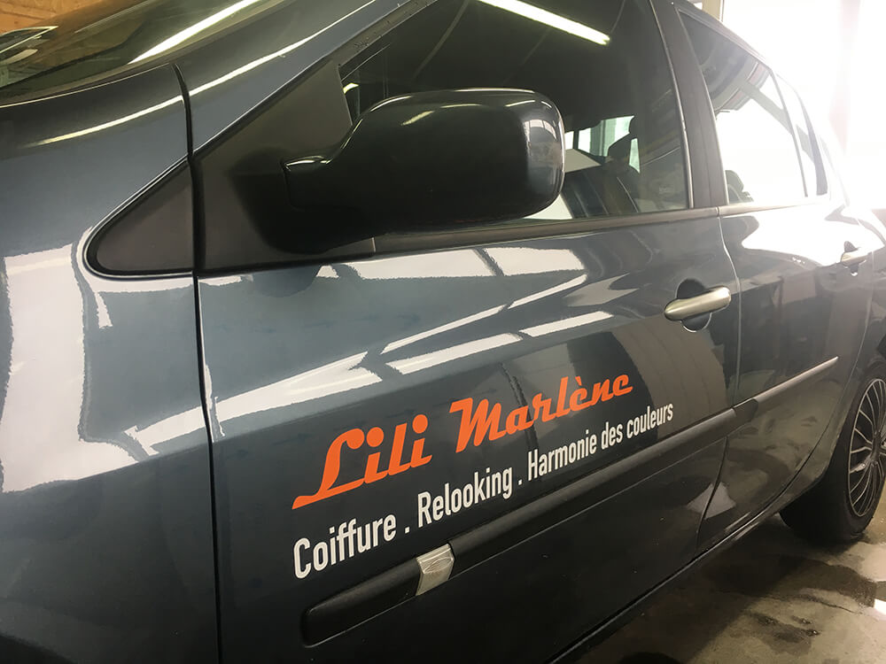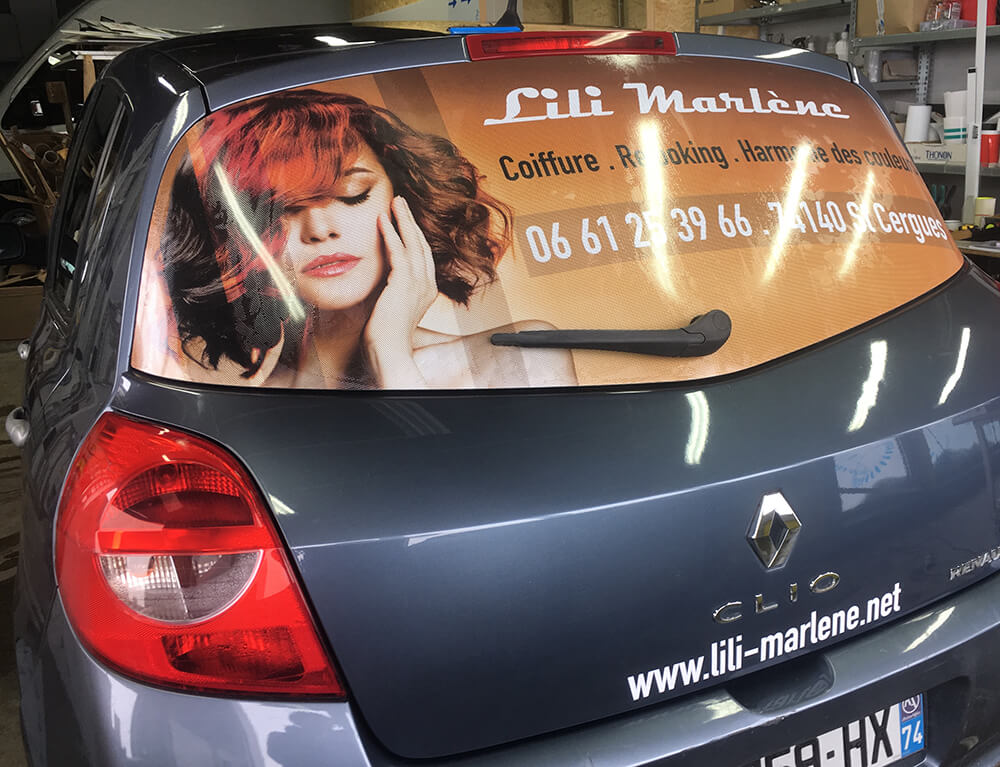 Réalisation d’un covering partiel pour une coiffeuse installée à Saint-Cergues. Décor réalisé par notre partenaire graphique OAK-Webdesign.