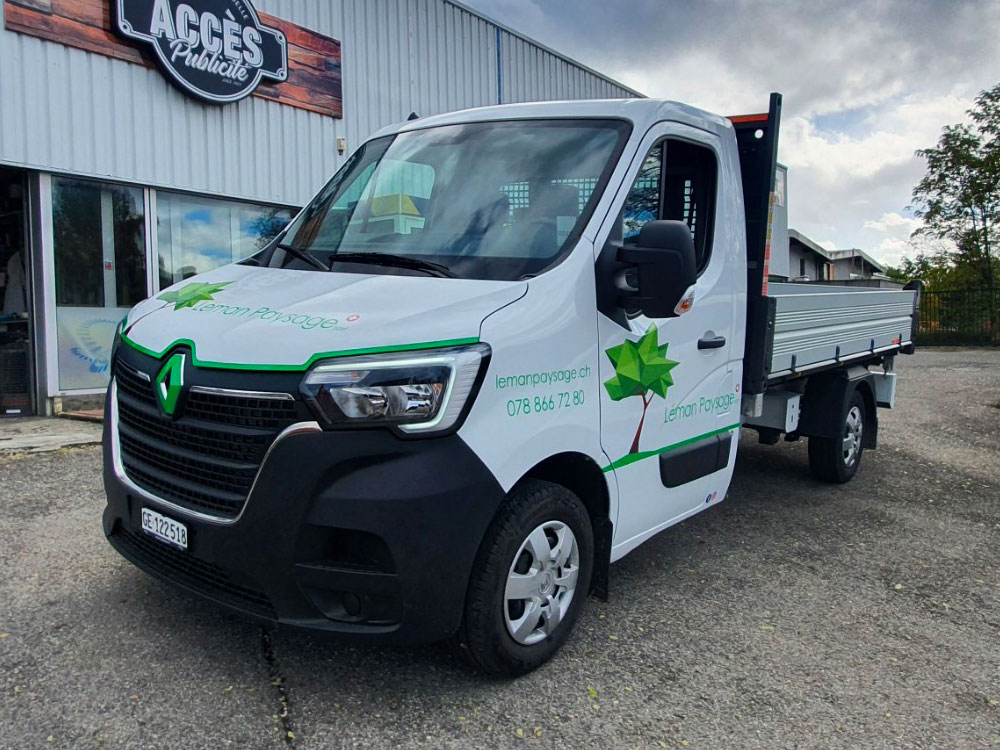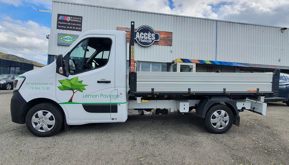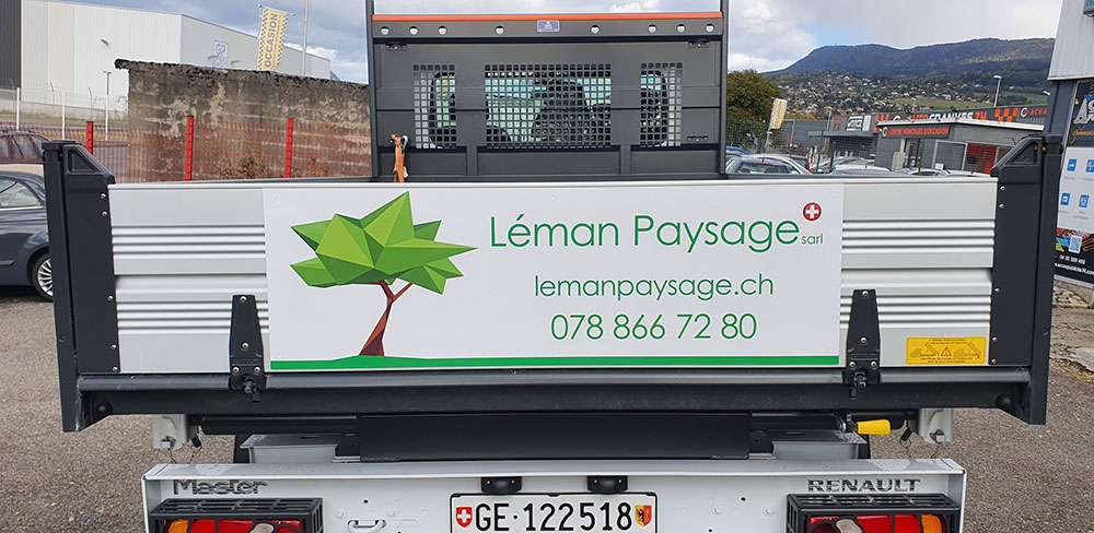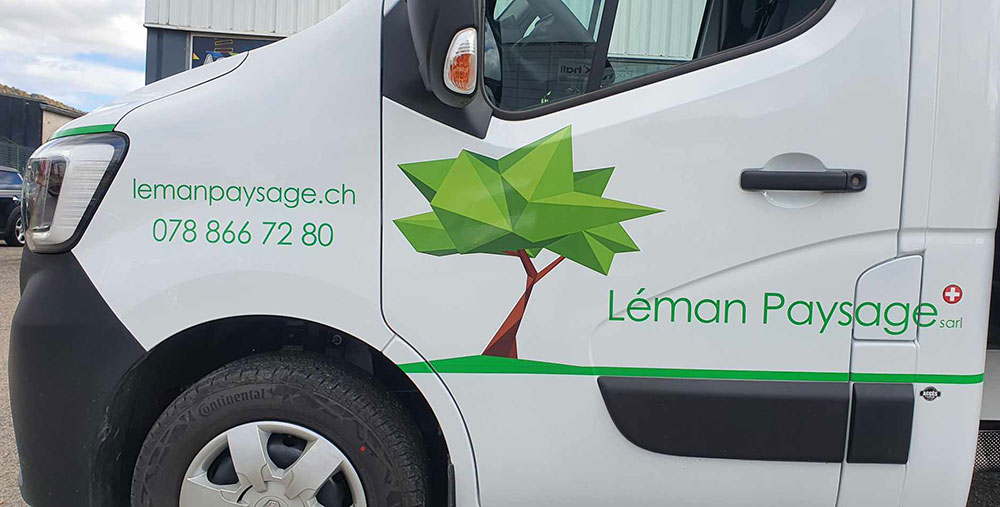 Réalisation d’un covering partiel sur le nouveau véhicule de ce paysagiste Suisse installé à Genève. Décor fourni par le client et décliné sur toute la flotte de véhicules de l’entreprise.