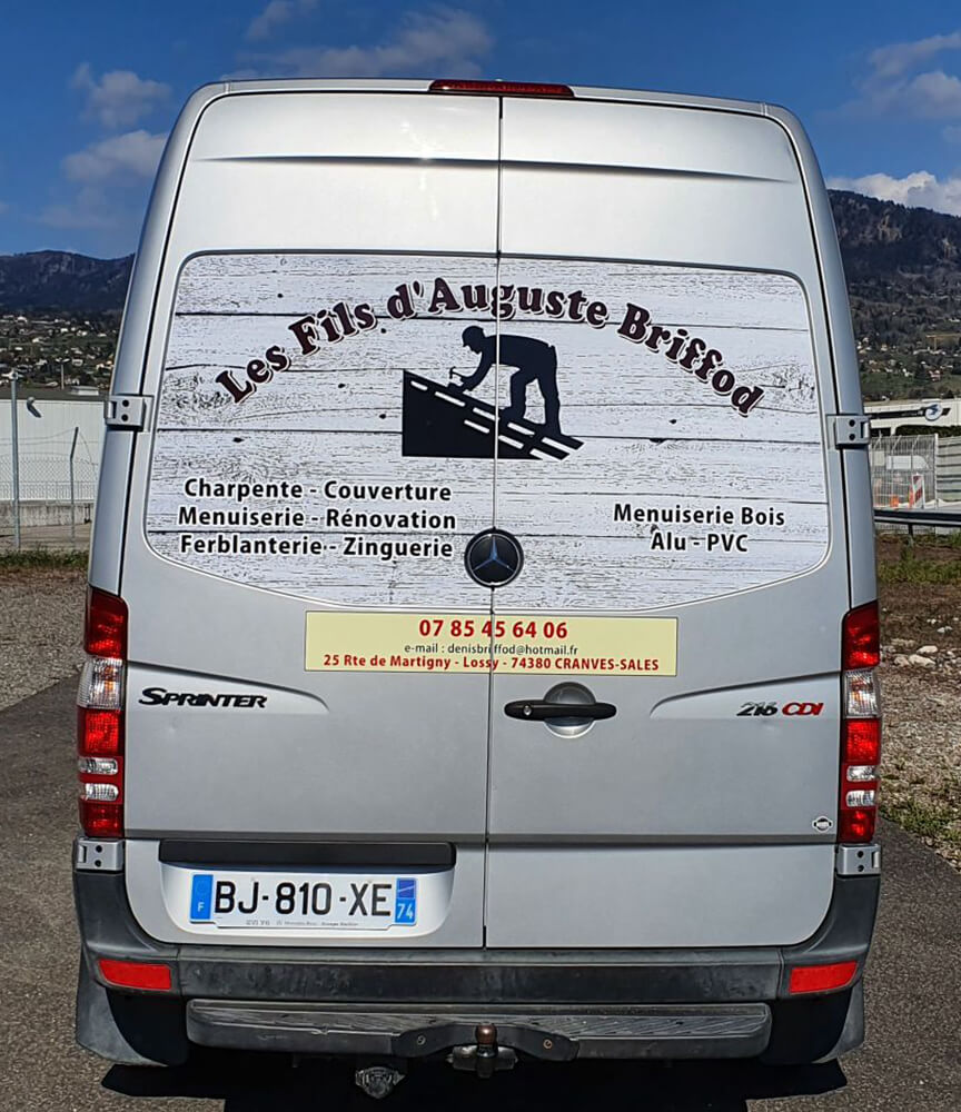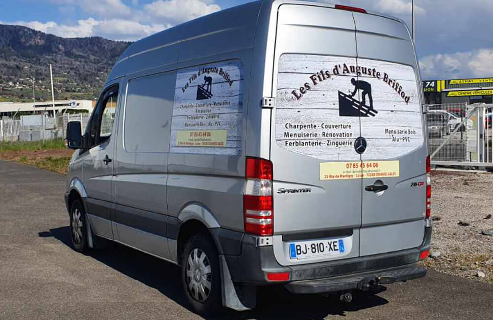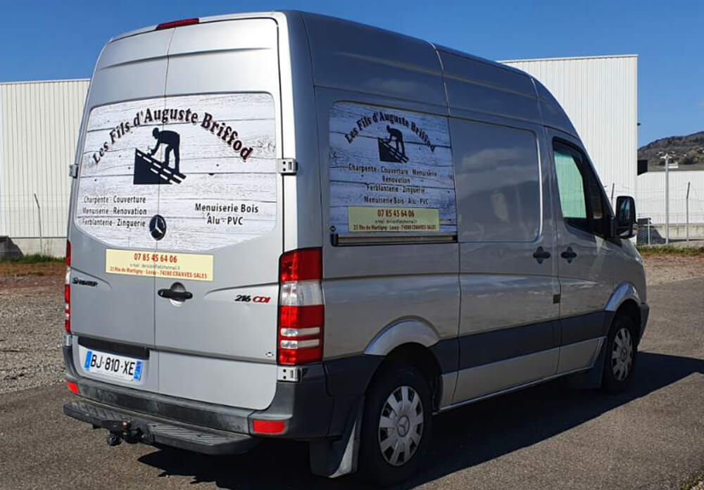 Réalisation d’un covering partiel sur le nouveau véhicule de cette entreprise de charpenterie installée à Cranves-Sales. Décor réalisé par nos soins et décliné sur toute la flotte de véhicules.
