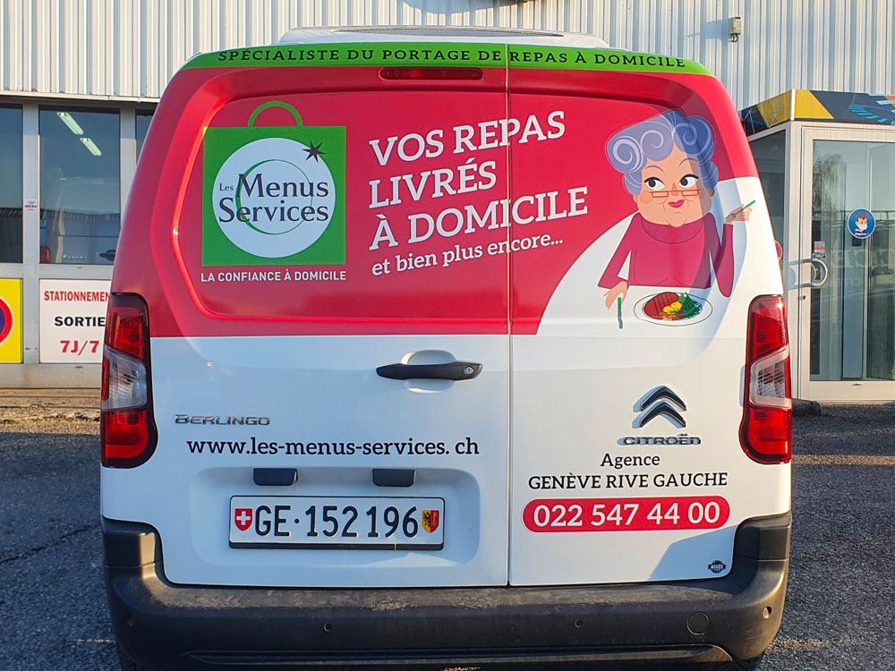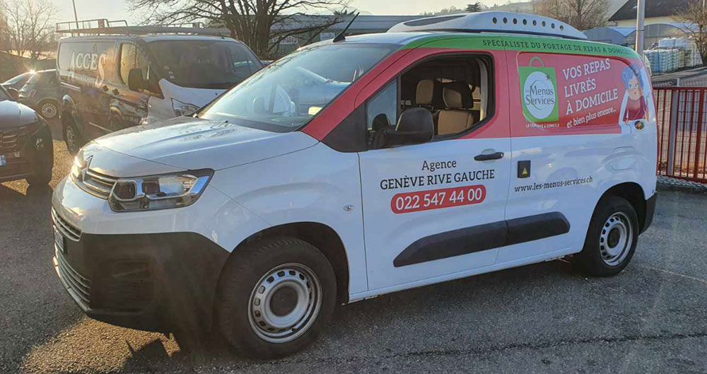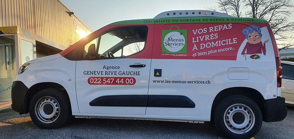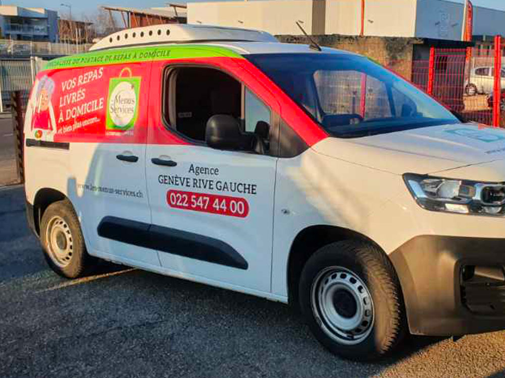Réalisation d’un covering partiel sur le nouveau véhicule de cette entreprise Suisse spécialisée dans le portage de repas à domicile. Décor fourni par le client.