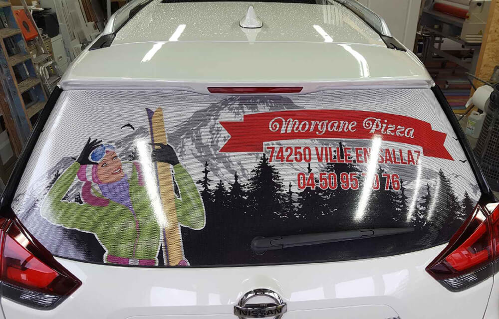 Décoration de la lunette arrière en adhésif micro-perforé sur le véhicule d’une pizzéria installée à Ville En Sallaz. Décor réalisé par notre partenaire graphique OAK-Webdesign.