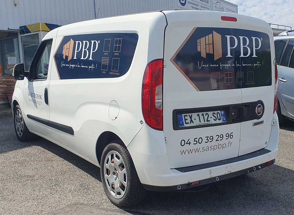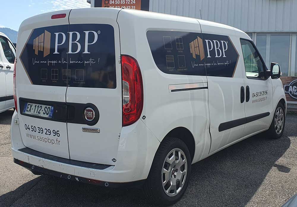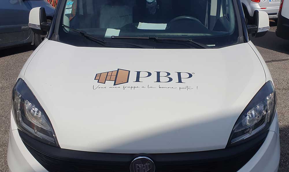 Réalisation d’un covering partiel sur le véhicule de PBP, votre spécialiste de la menuiserie en Haute-Savoie. Décor réalisé par nos soins.