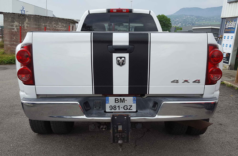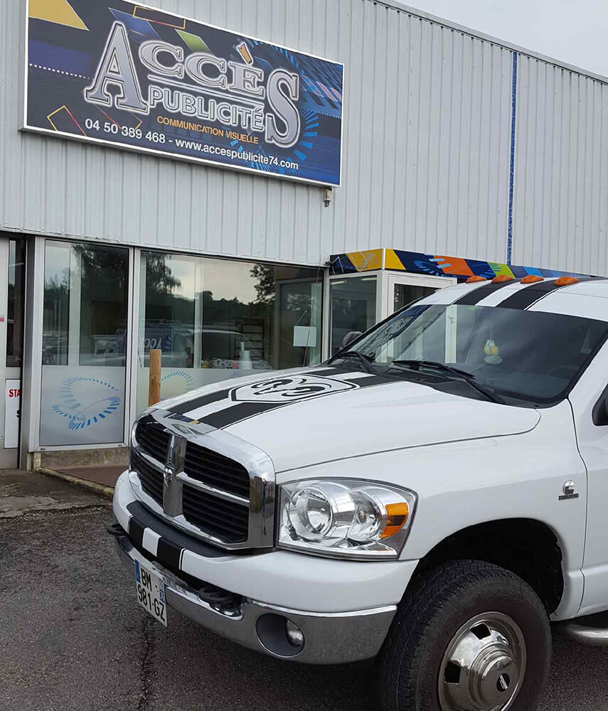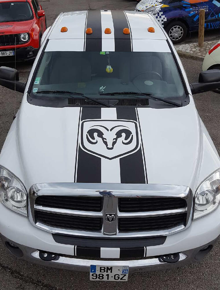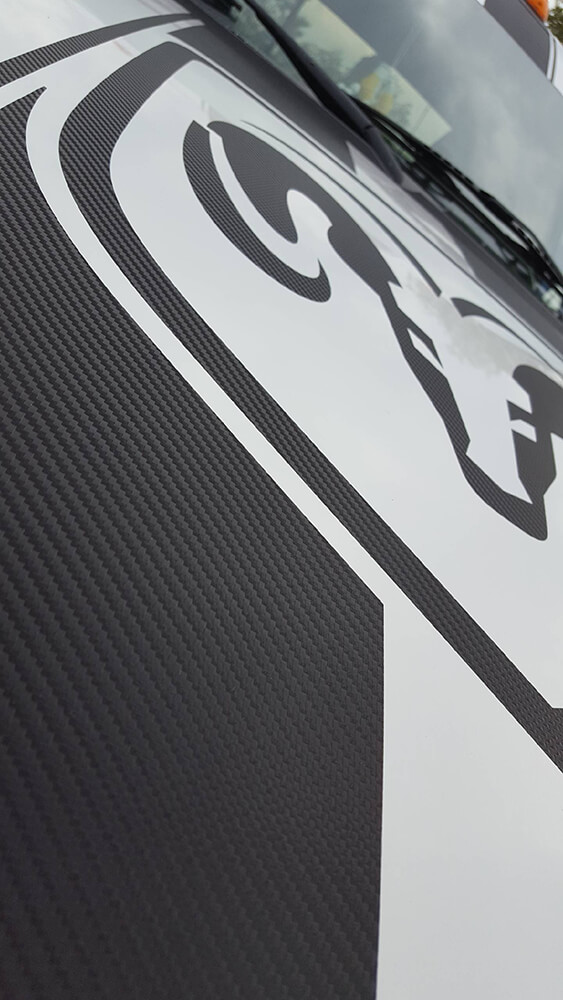 Réalisation d’un covering partiel afin de personnaliser le véhicule d’un particulier. Décor réalisé par nos soins.