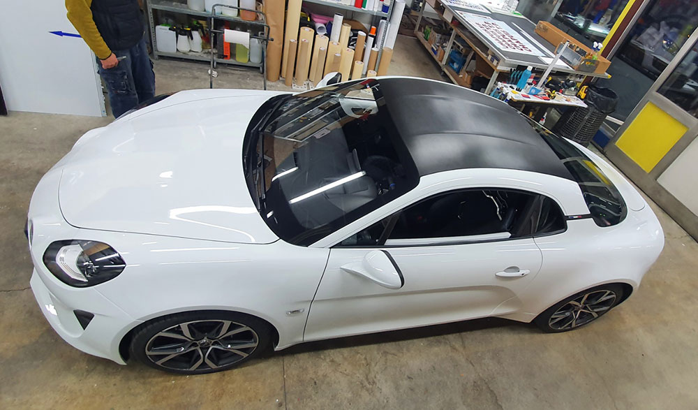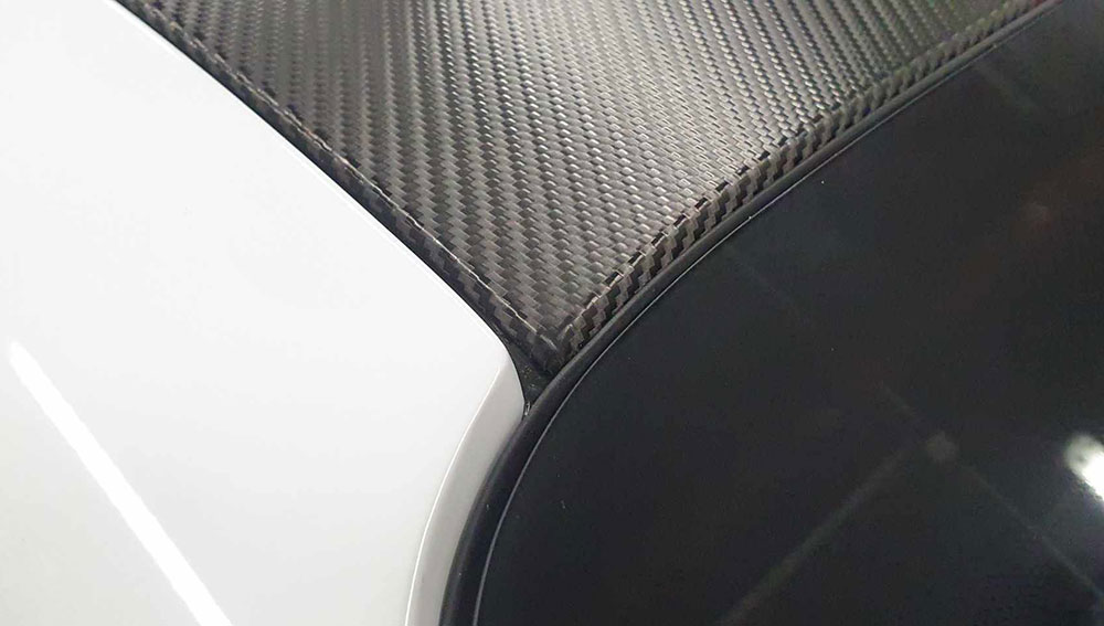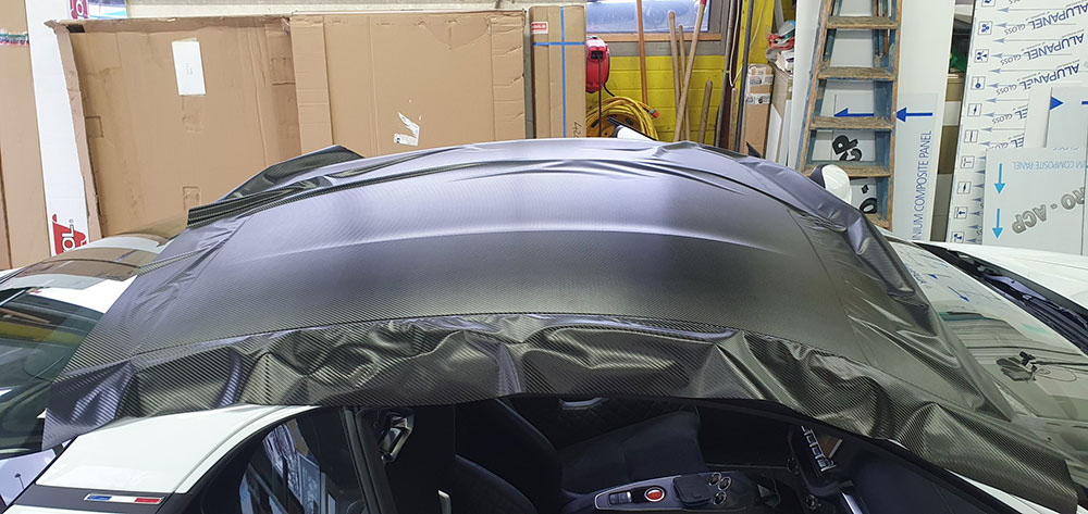 Mise en place d’un décor adhésif effet carbone sur le toit de ce véhicule de sport d’un particulier. Décor réalisé par nos soins.