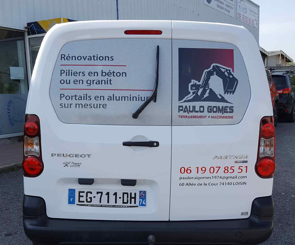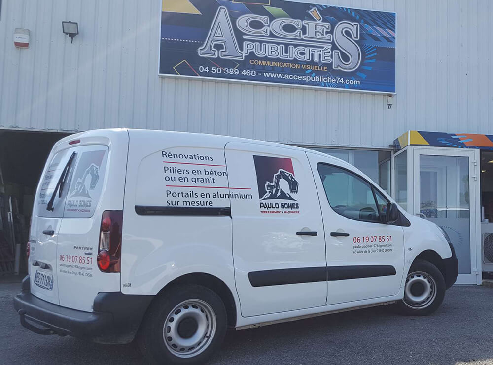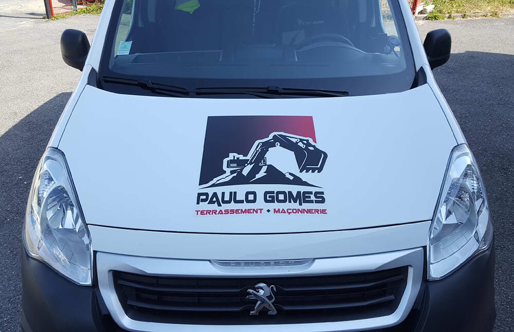 Réalisation d’un covering partiel pour une entreprise de terrassement/maçonnerie. Décor réalisé en collaboration avec notre partenaire graphique OAK-Webdesign.