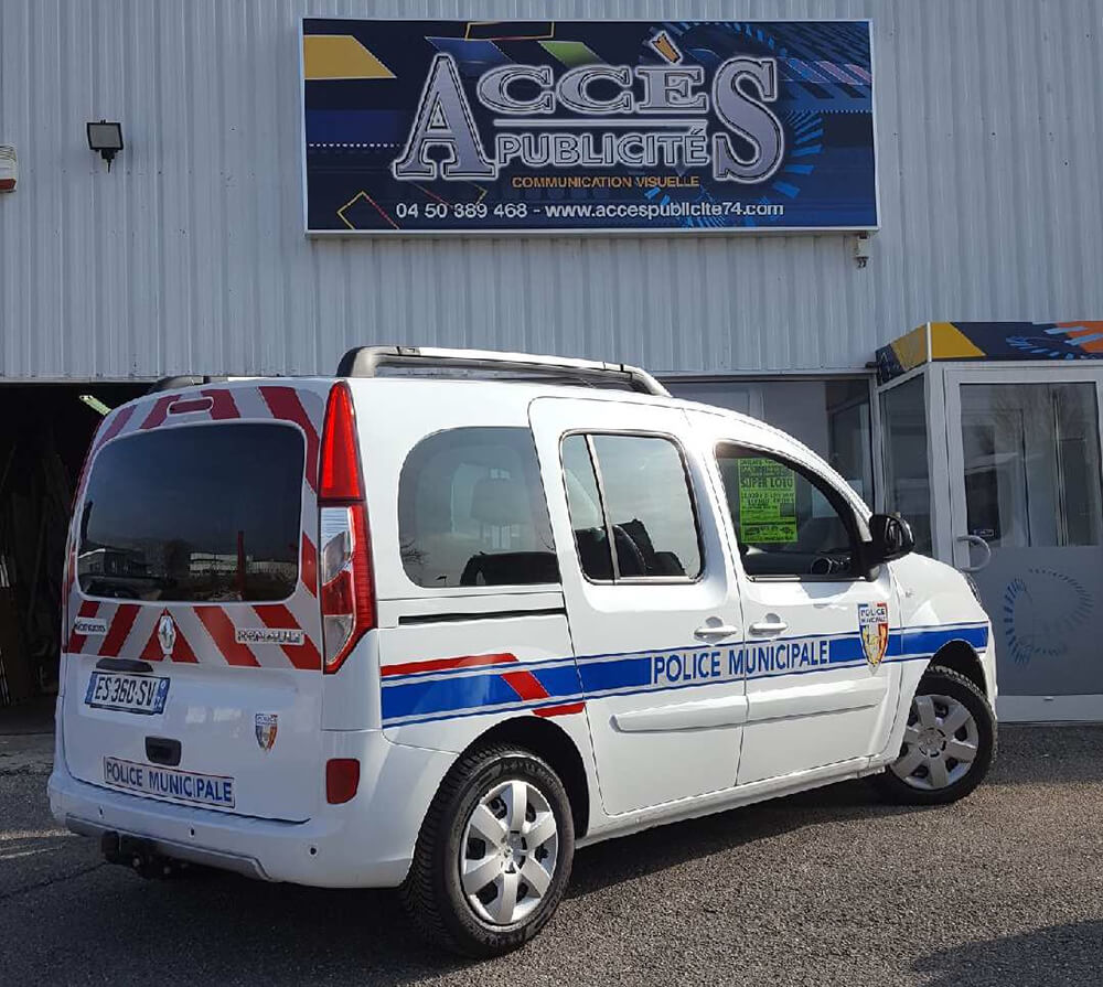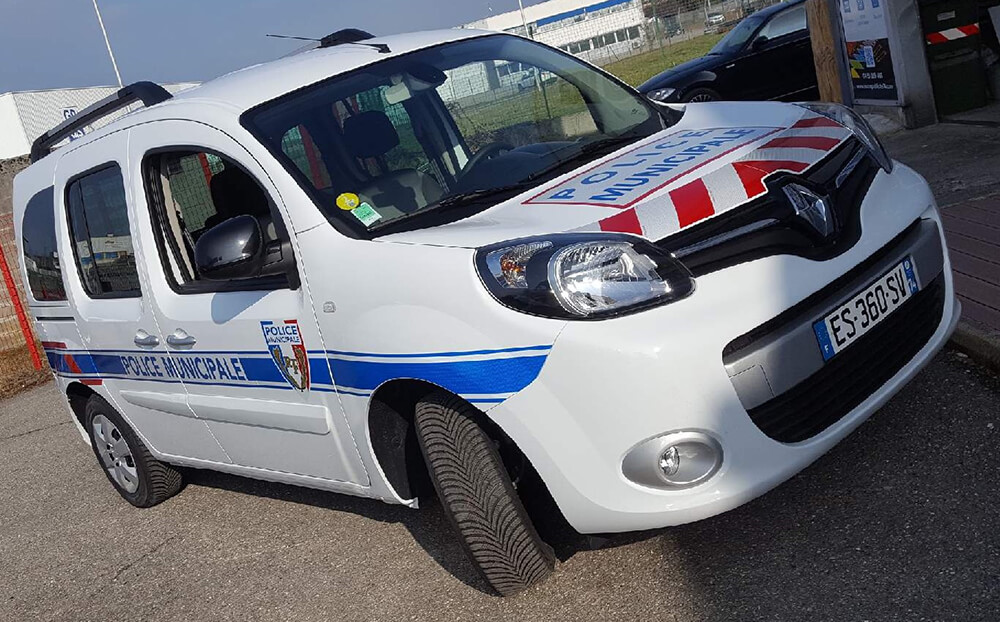 Réalisation d’un covering partiel sur les véhicules de la police municipale basée à Cranves-Sales. Ce décor respecte les normes nationales des véhicules de police.
