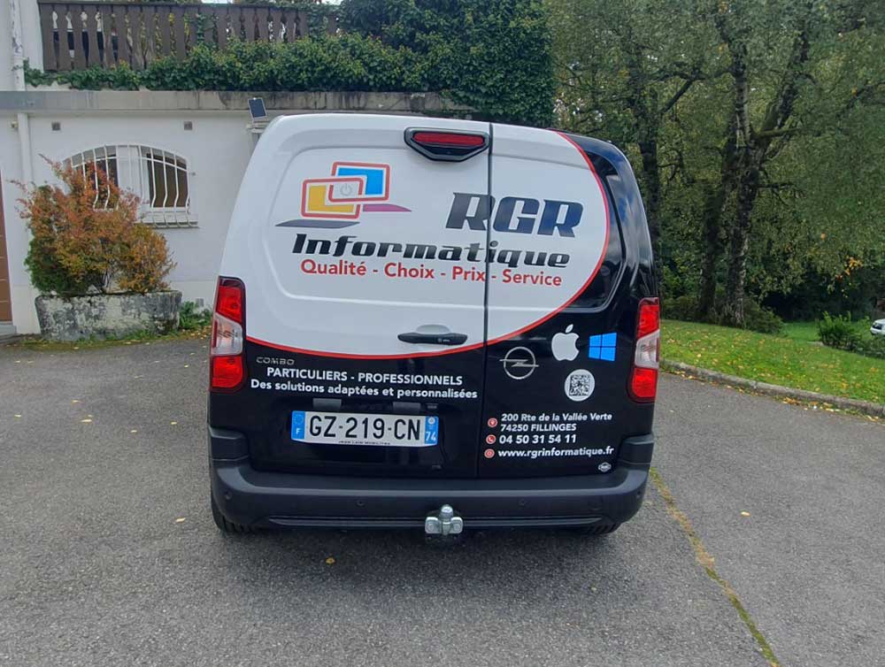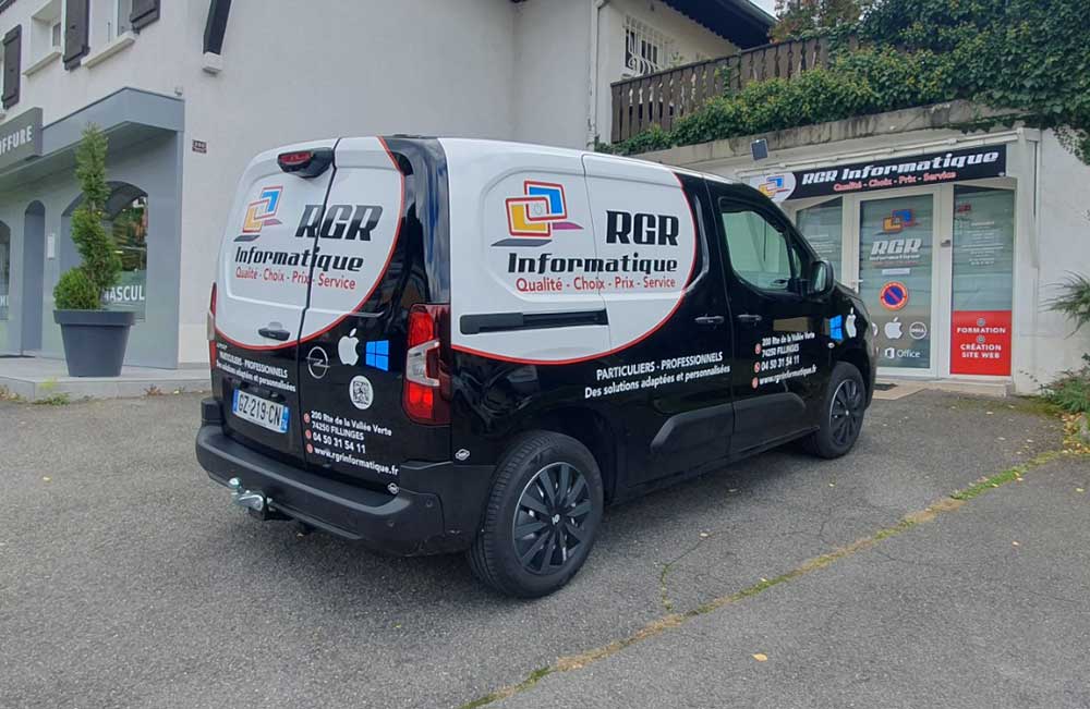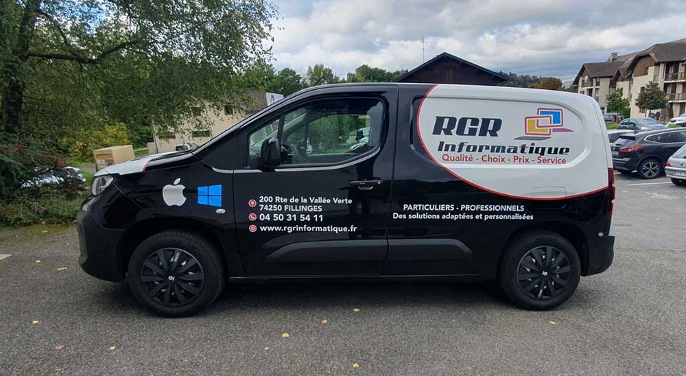 Covering partiel réalisé sur le nouveau véhicule de RGR Informatique, informaticien basé à Fillinges. Une création sur mesure signée par nos soins !