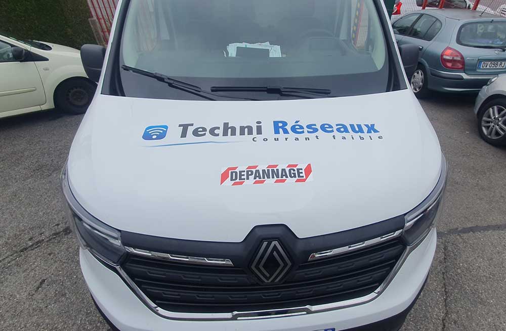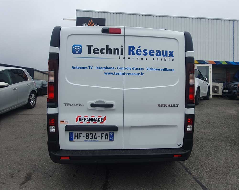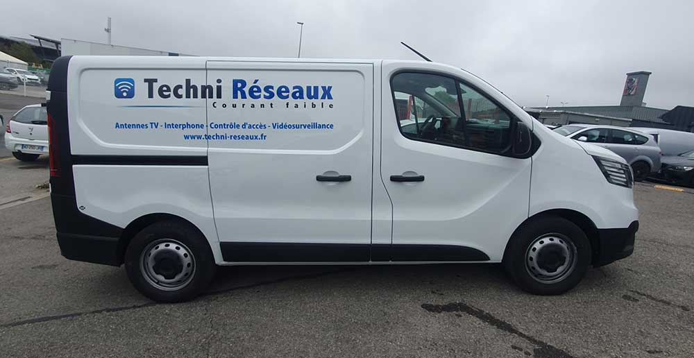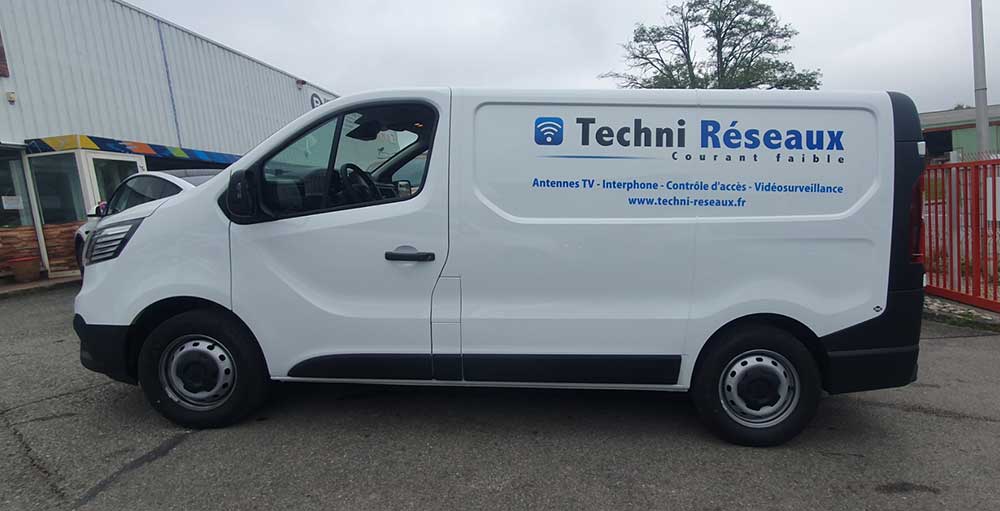 Réalisation d’un covering partiel sur le nouveau véhicule d’une entreprise spécialisée dans le domaine du courant faible : antennes TV, interphones, contrôles d’accès et vidéosurveillance.