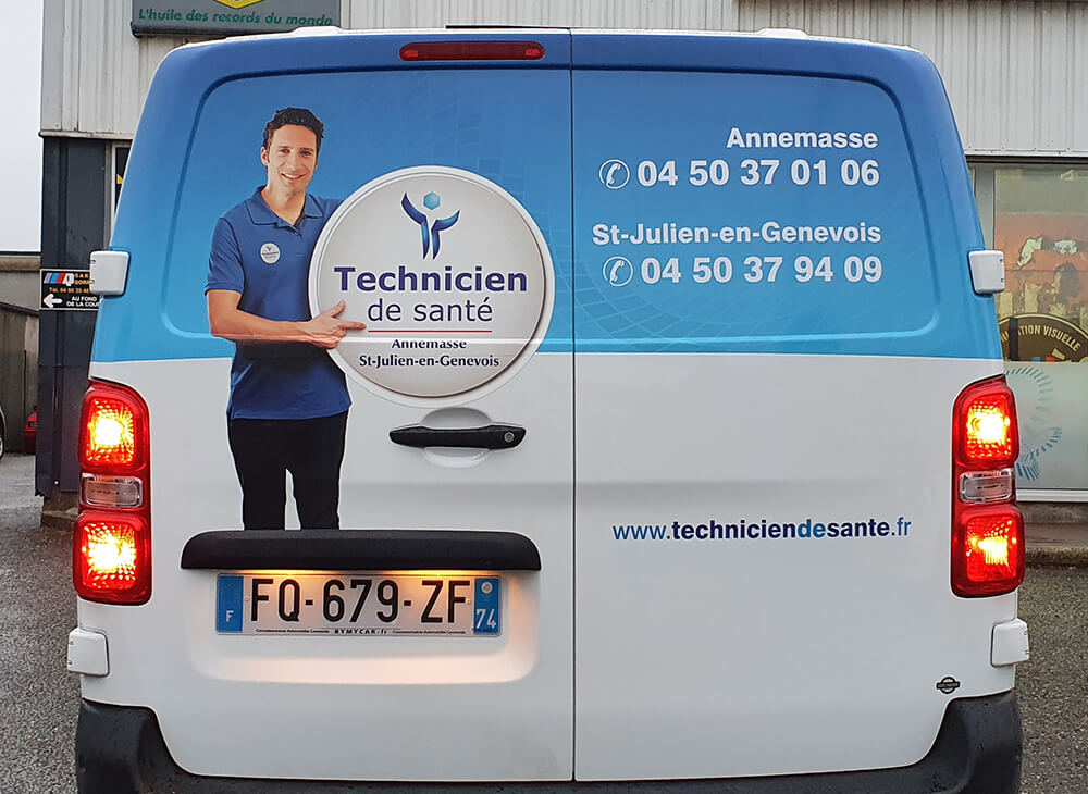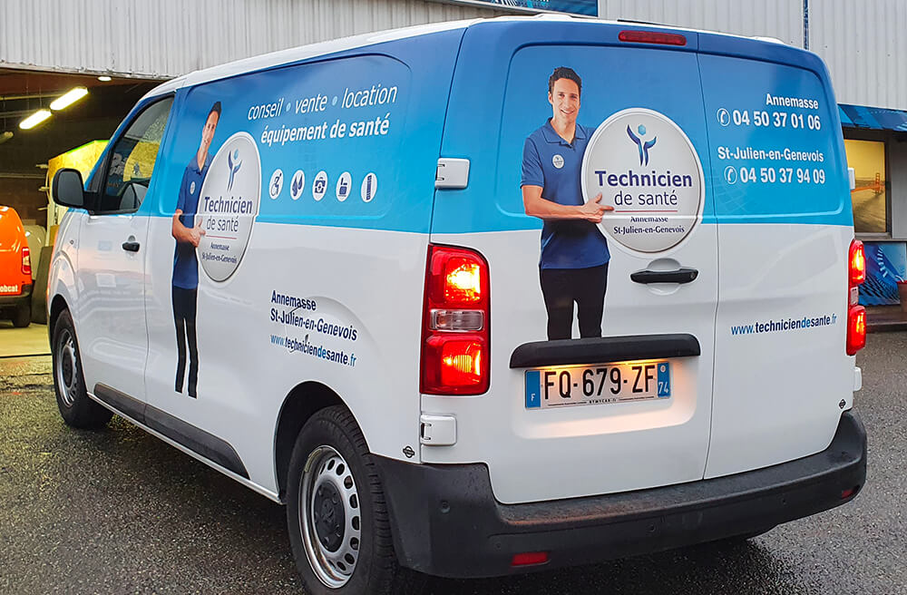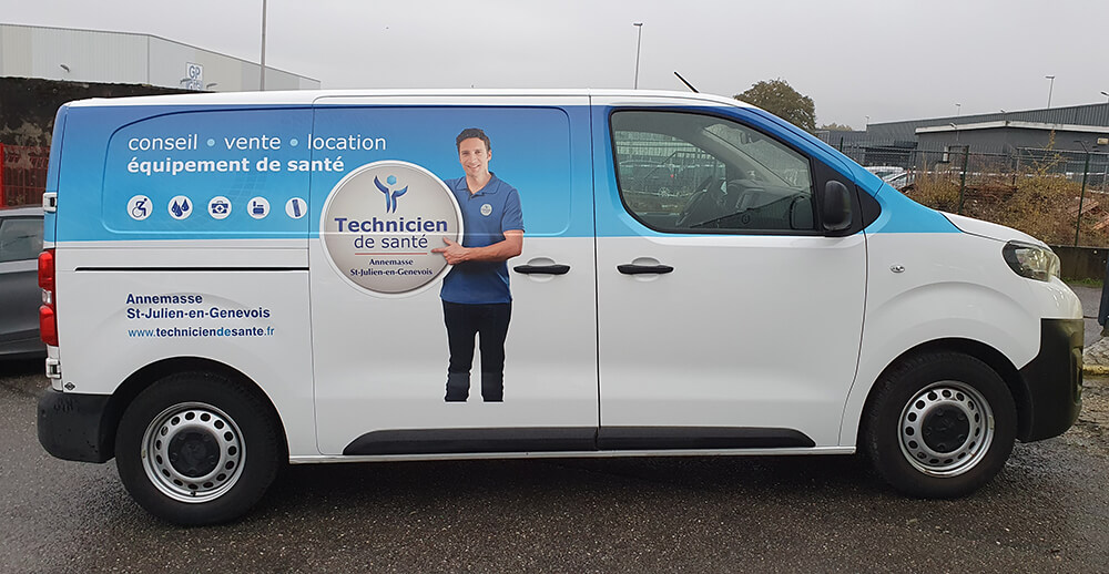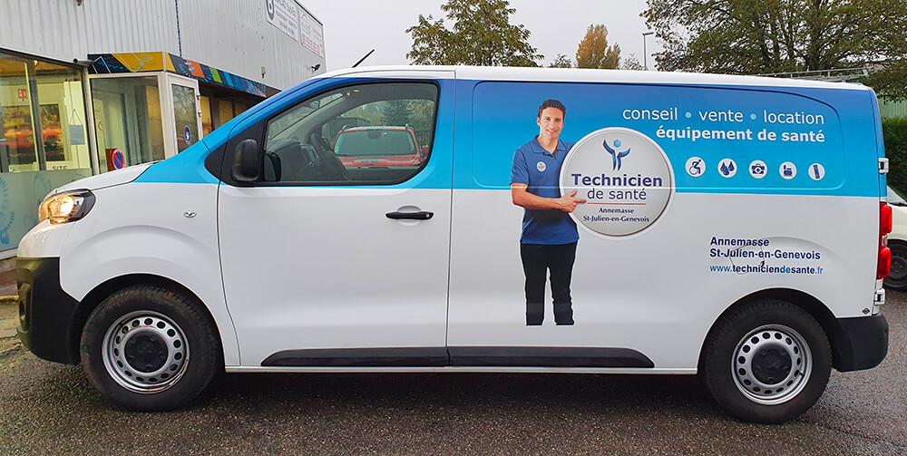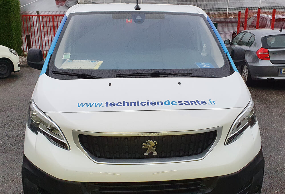 Réalisation d’un covering partiel sur le nouveau véhicule de cette société spécialisée dans la commercialisation de matériel médical. Décor fourni par le client et décliné sur toute la flotte de véhicules de l’entreprise.