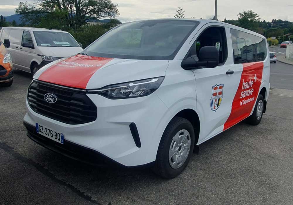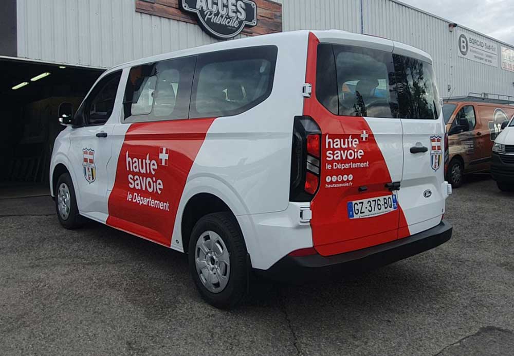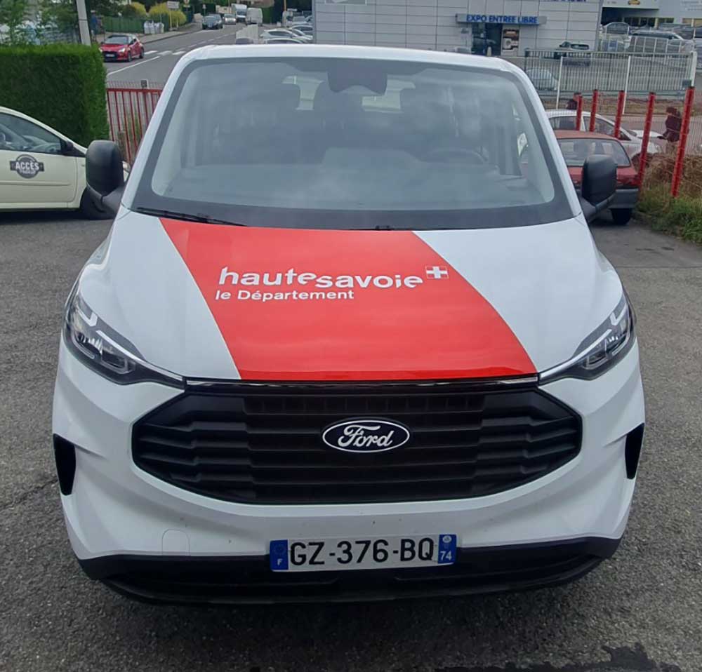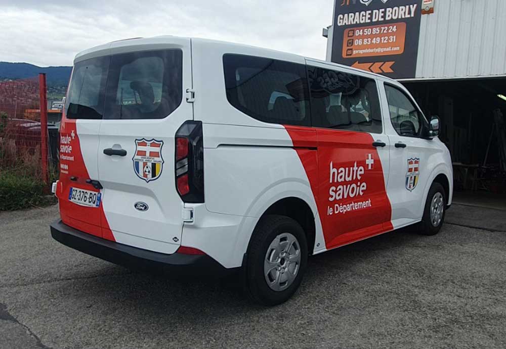 Réalisation d’un covering partiel sur le véhicule financé par le département de la Haute-Savoie pour le club de football de l’Union Sportive Annemasse Ambilly Gaillard. Décor réalisé par nos soins.