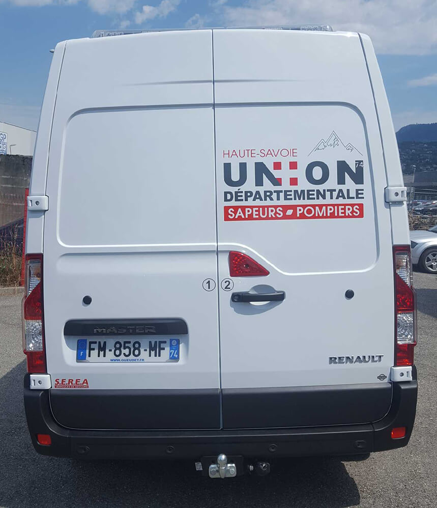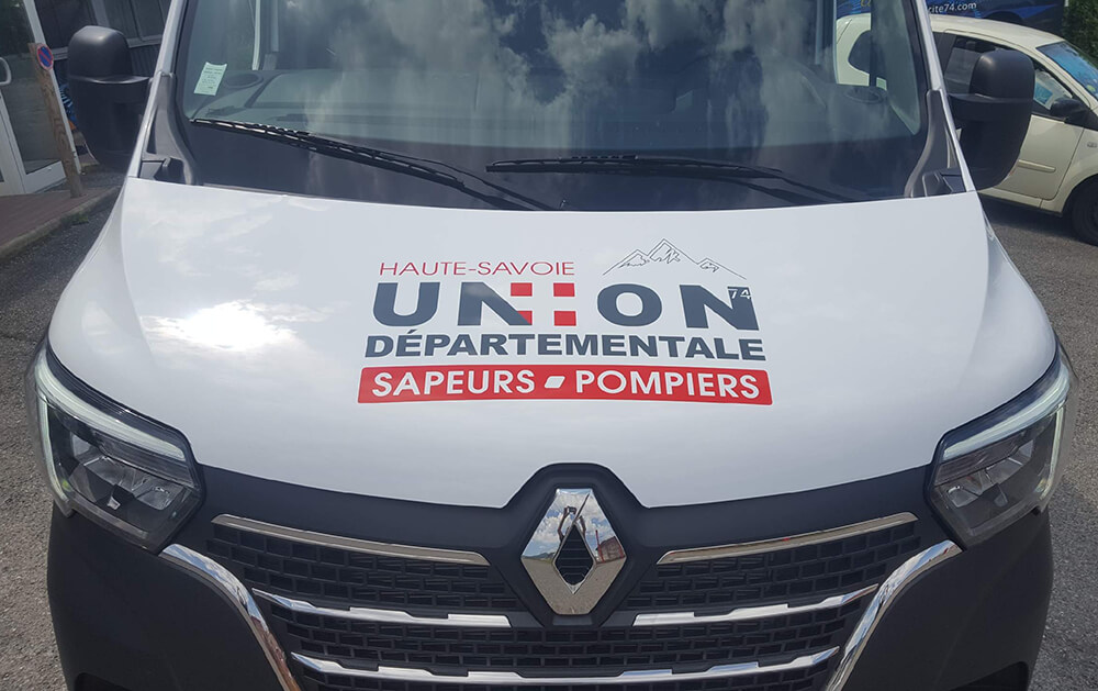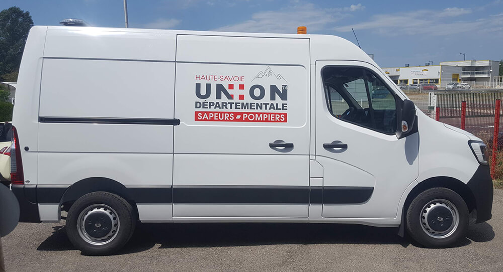 Réalisation d’un covering partiel sur le nouveau véhicule de l’union départementale des sapeurs-pompiers de Haute-Savoie. Décor fourni par le client.