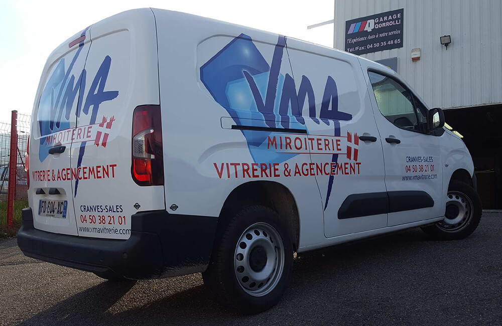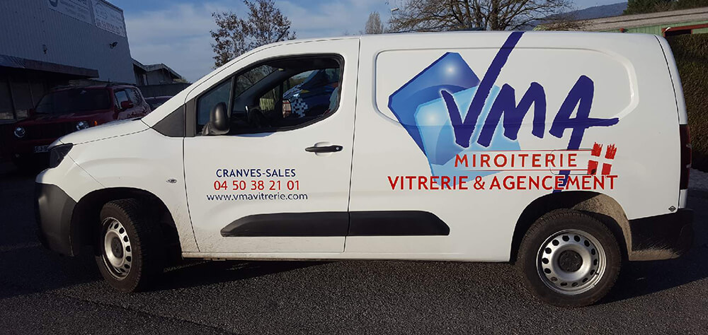Réalisation d’un covering partiel pour les véhicules de la société VMA Miroiterie spécialisée dans la vitrerie et l’agencement. Ce décor a été décliné sur toute la flotte de véhicules de l’entreprise. Décor réalisé par nos soins
