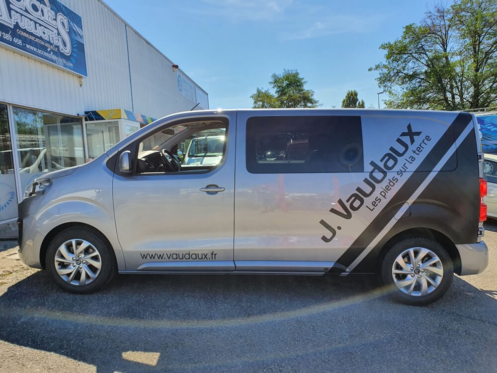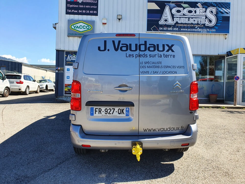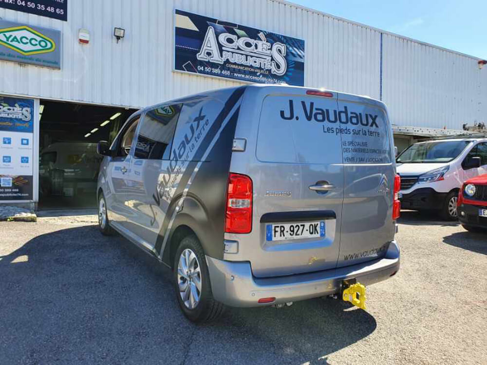 Réalisation d’un covering partiel avec application de la nouvelle charte graphique de l’entreprise Vaudaux spécialisée dans la vente de machines agricoles. Décor fourni par le client.
