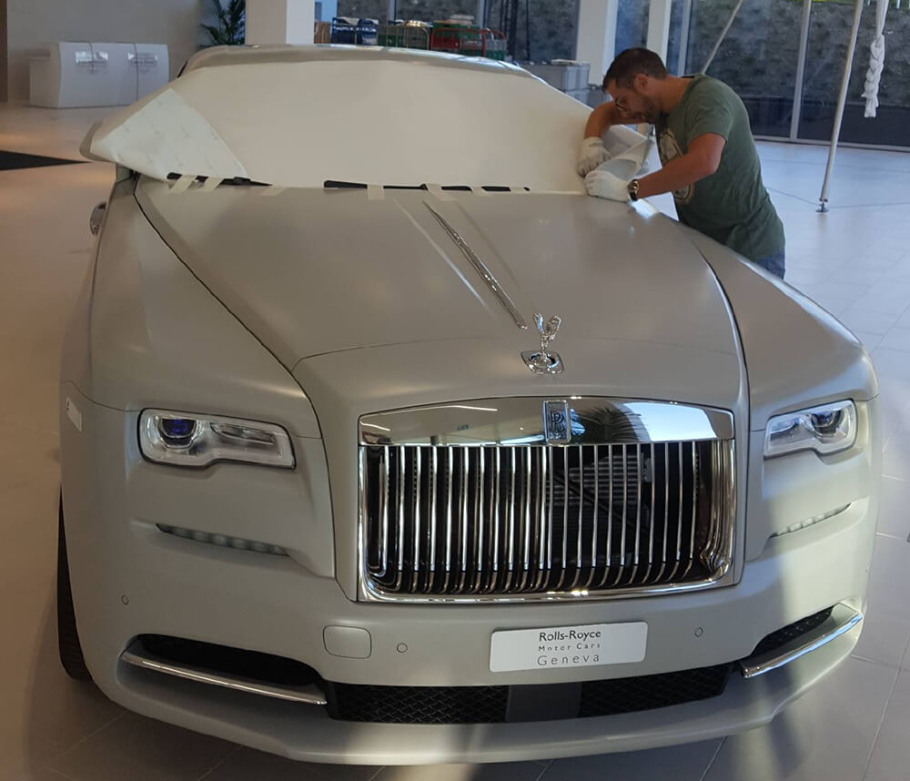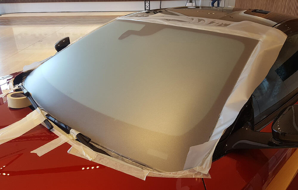 Pose de films dépolis sur les parebrises de véhicules permettant la diffusion d’animations vidéos pour un concessionnaire de Nyon (Suisse).