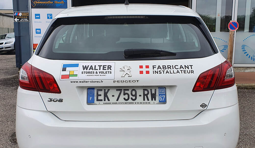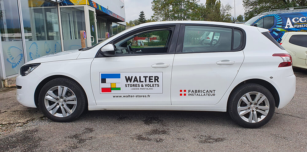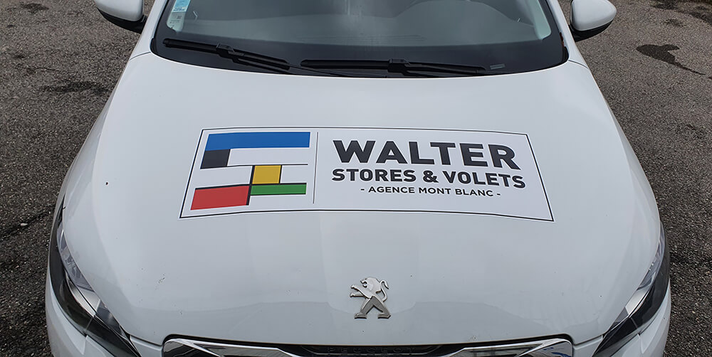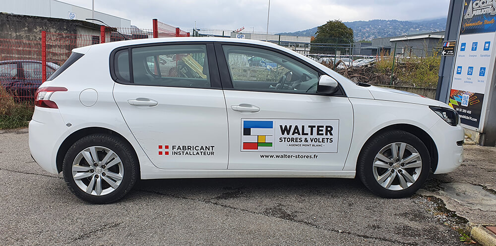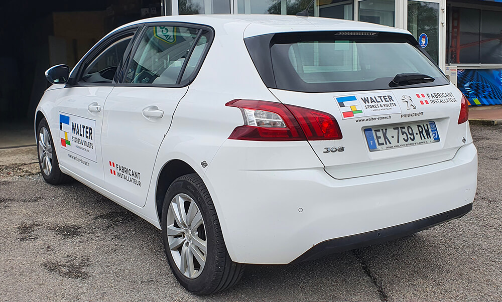 Réalisation d’un covering partiel sur le véhicule de ce fabricant et installateur de stores et volets. Décor réalisé par nos soins.
