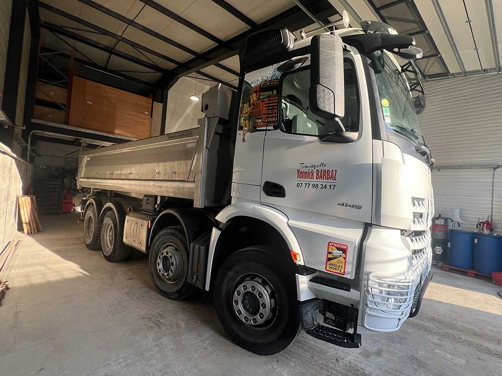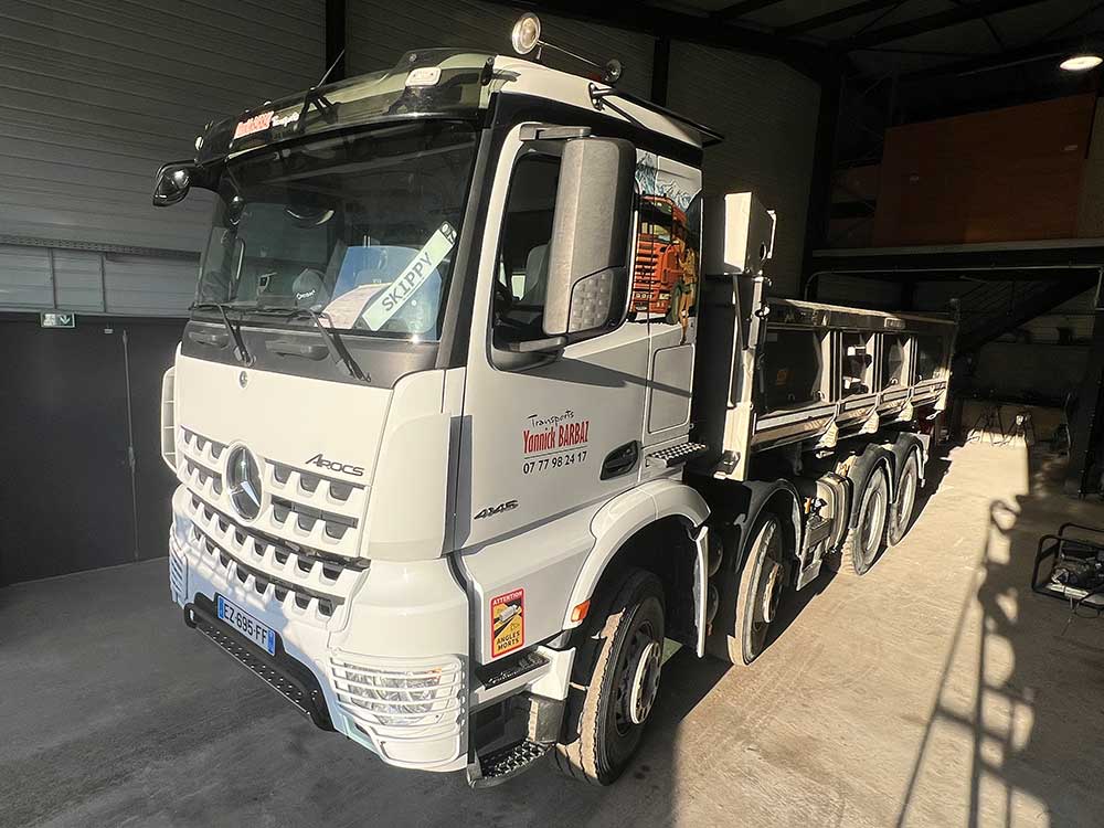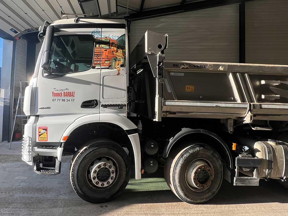 Réalisation d’un covering partiel XXL sur la flotte de véhicules de cette entreprise spécialisée dans le transport de matériaux de construction. Un visuel impactant imaginé par notre partenaire graphique OAK-Webdesign.
