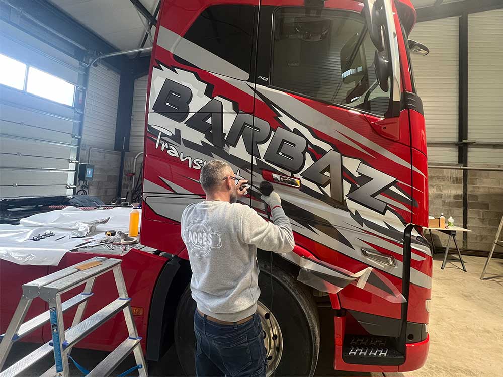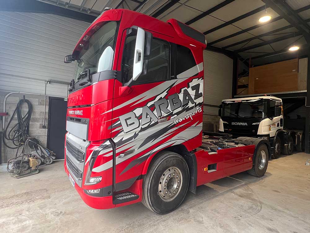 Réalisation d’un covering partiel XXL sur le dernier véhicule de cette entreprise spécialisée dans le transport de matériaux de construction. Le décor a été conçu par notre partenaire graphique OAK-Webdesign.