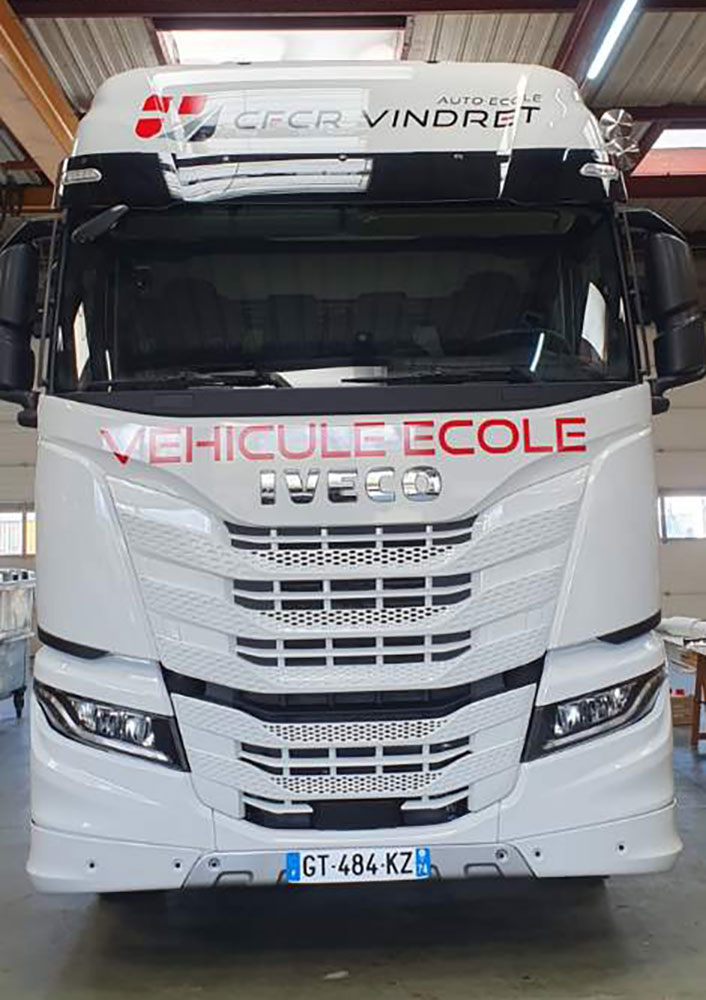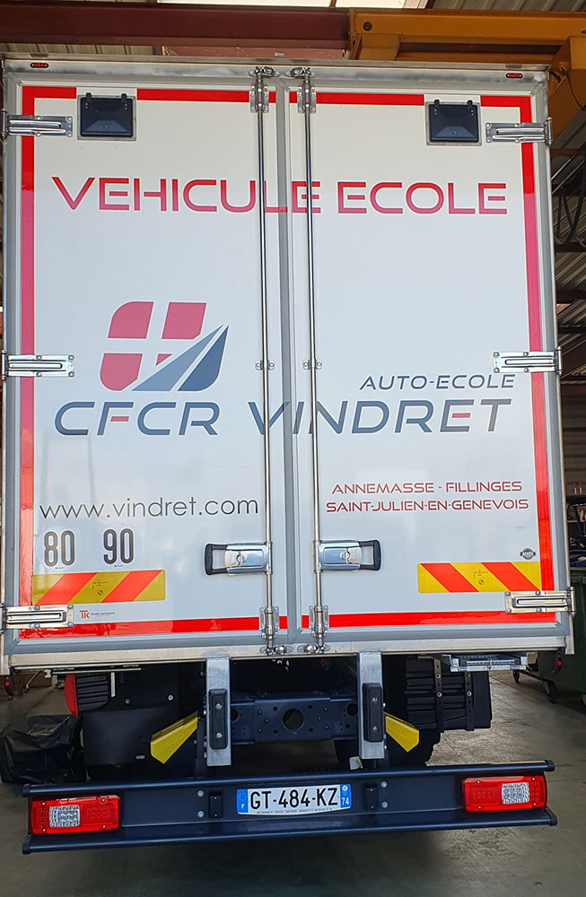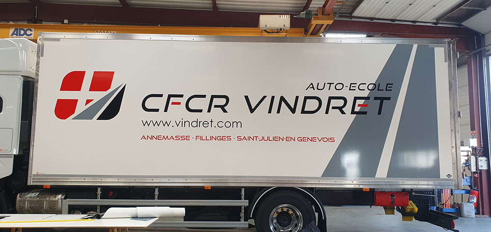 Réalisation d’un covering partiel XXL pour ce véhicule école de l’entreprise Vindret. Décor réalisé par nos soins et décliné sur toute la flotte de véhicules de l’entreprise.
