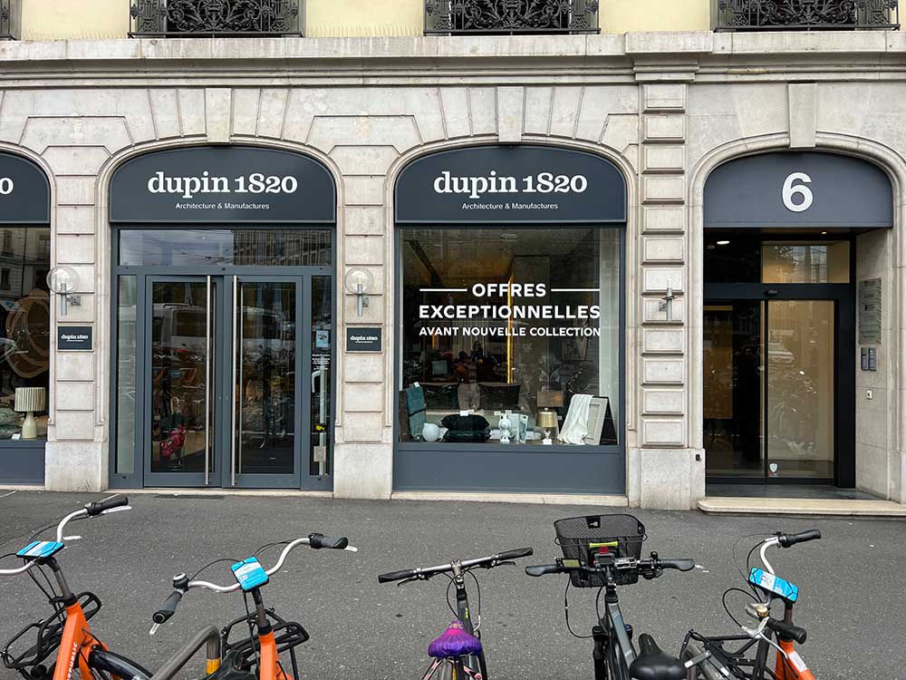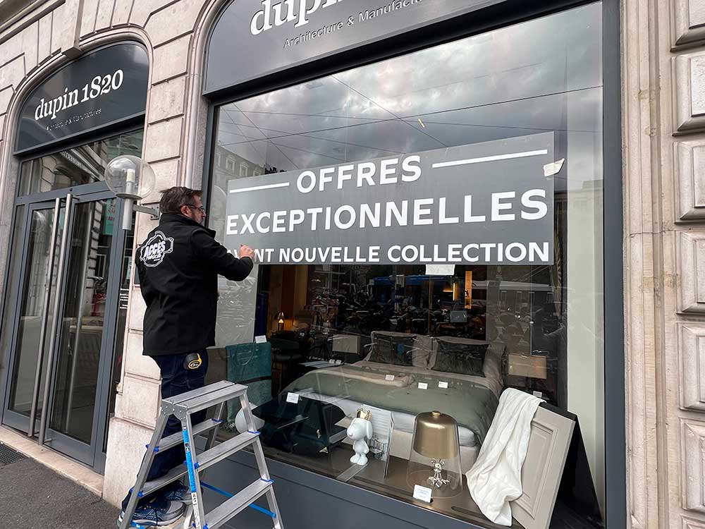 Fourniture et mise en place d’un décor adhésif sur les vitrines du magasin DUPIN 1820 de Rive à Genève pour annoncer une période de promotions avant l’arrivée d’une nouvelle collection. Décor réalisé par notre partenaire graphique OAK-Webdesign.