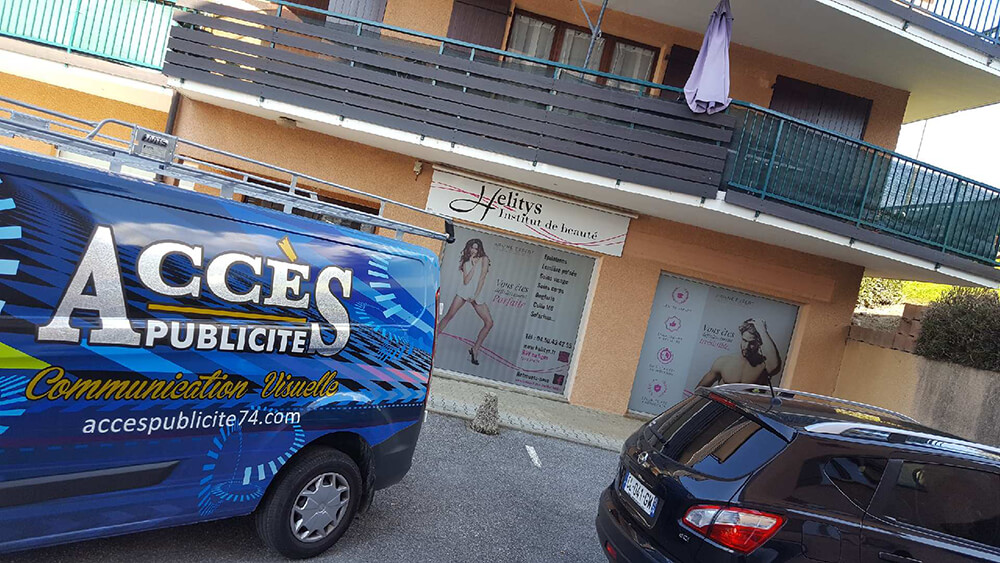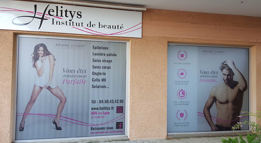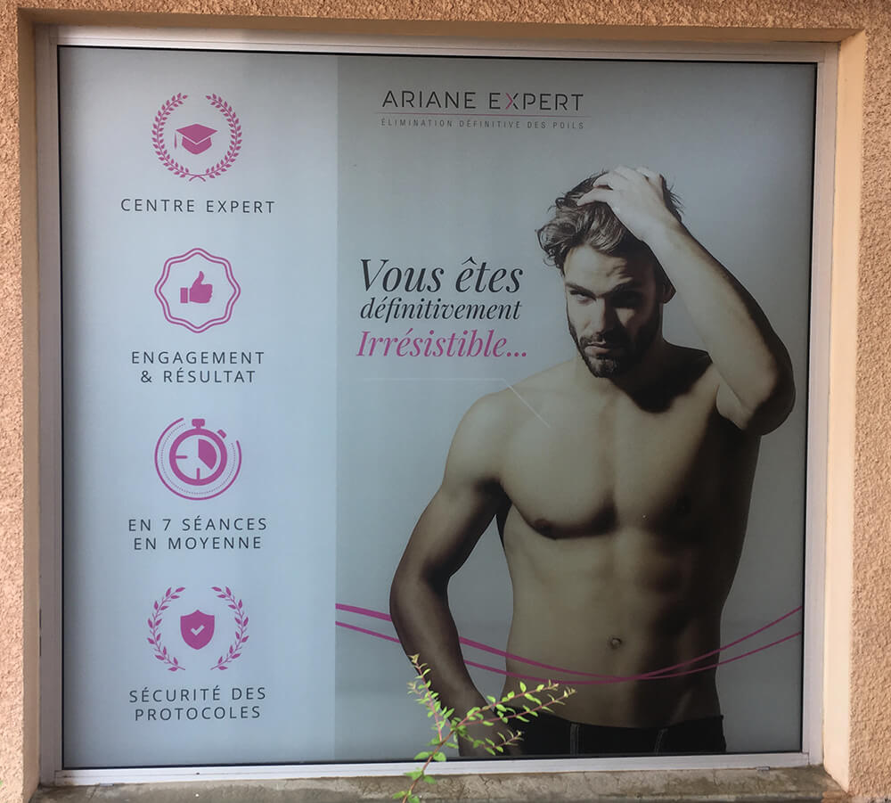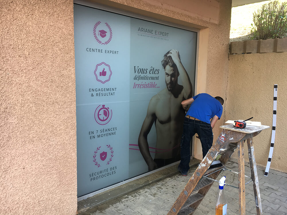 Création d’une décoration en adhésif dépoli afin d’isoler visuellement les clients de cet institut de beauté tout en laissant passer la lumière. Décor réalisé par notre partenaire graphique OAK-Webdesign.