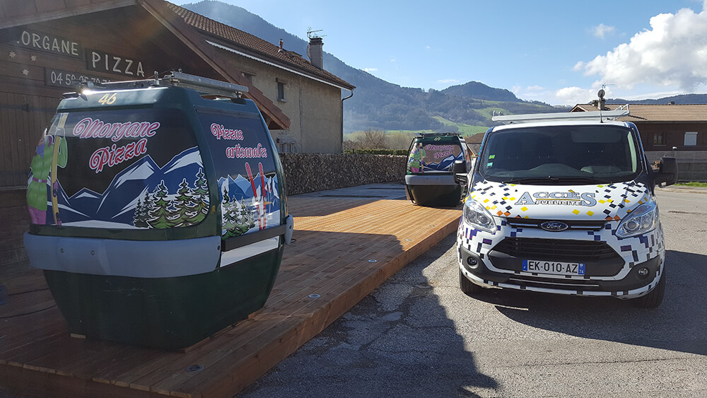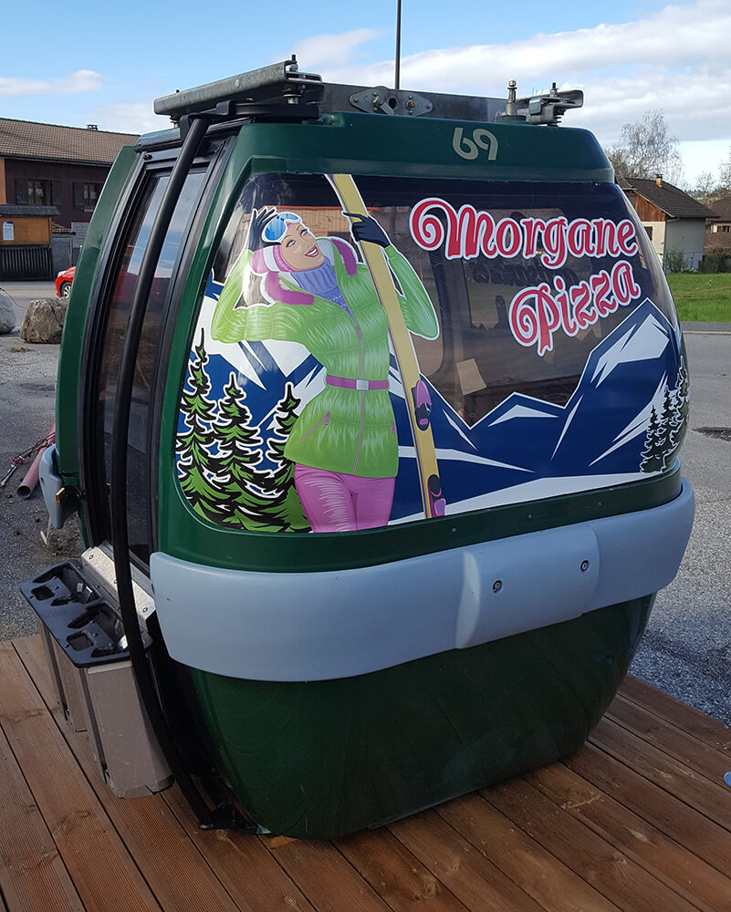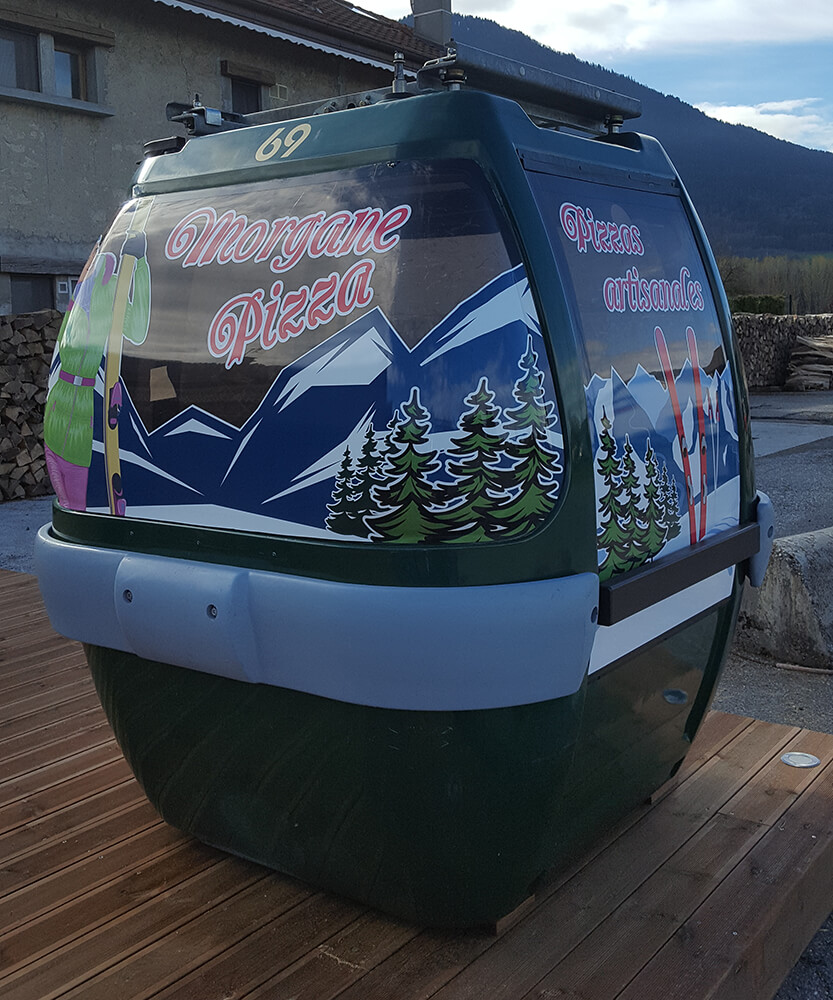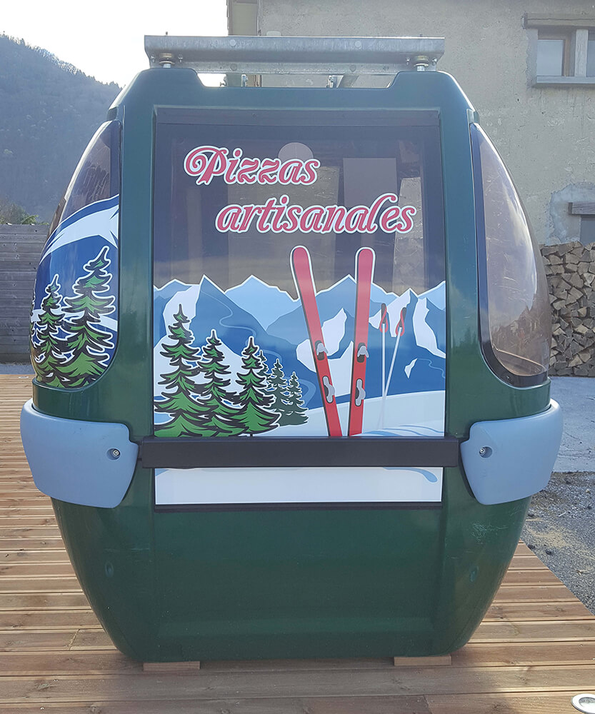 Création d’un décor adhésif original sur les cabines de ski d’une pizzeria. Décor réalisé par nos soins.