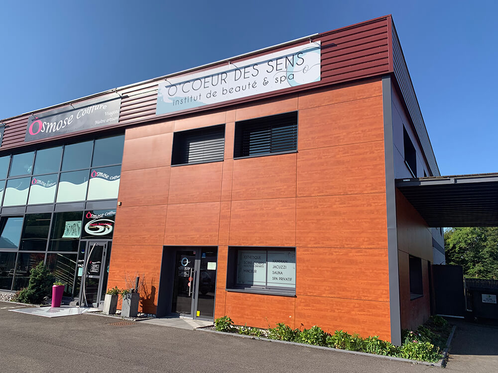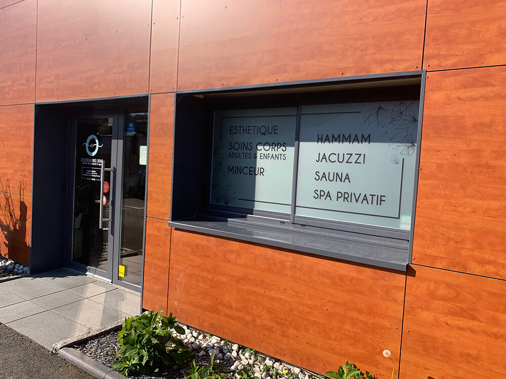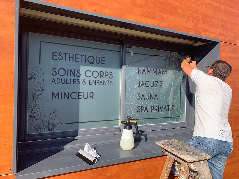 Mise en place d’un décor adhésif diffusant sur les vitres d’un institut de beauté installé à Perrignier. Création graphique réalisée par notre partenaire OAK-Webdesign.
