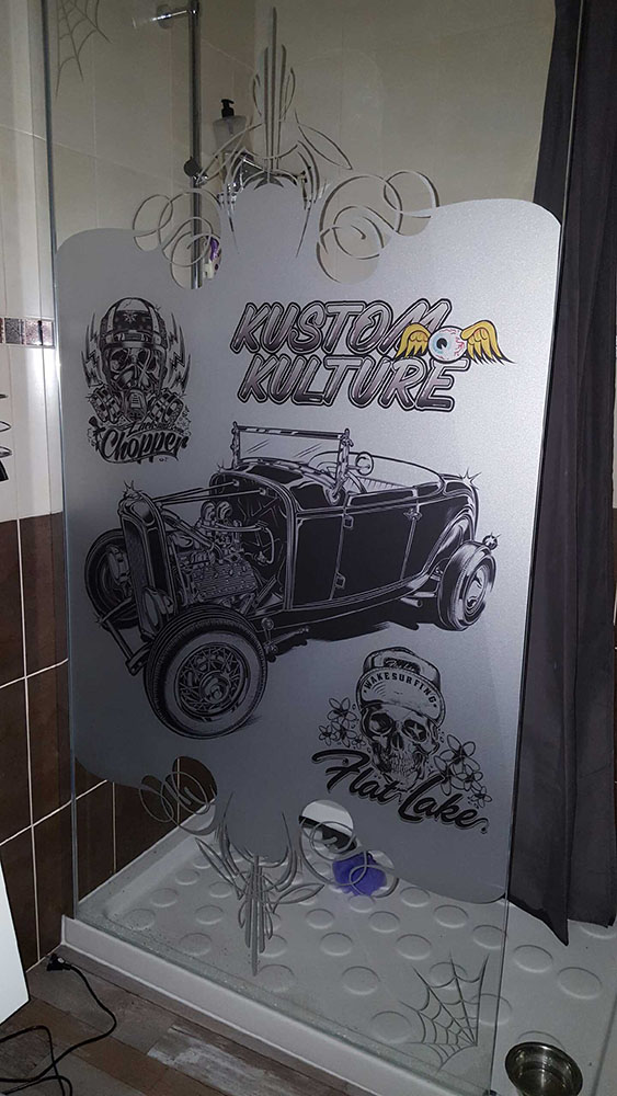 Création d’une décoration en adhésif dépoli pour une cabine de douche d’un particulier. Ce type d’adhésif est idéal pour créer une ambiance intime tout en laissant passer la lumière. Décor réalisé par nos soins