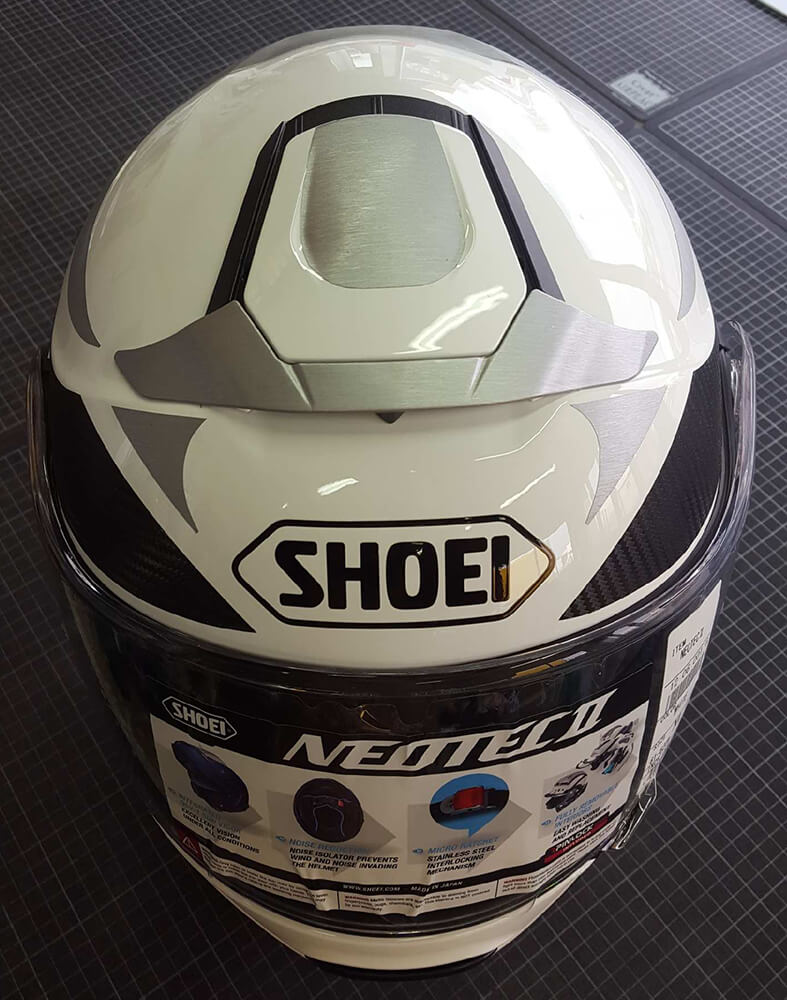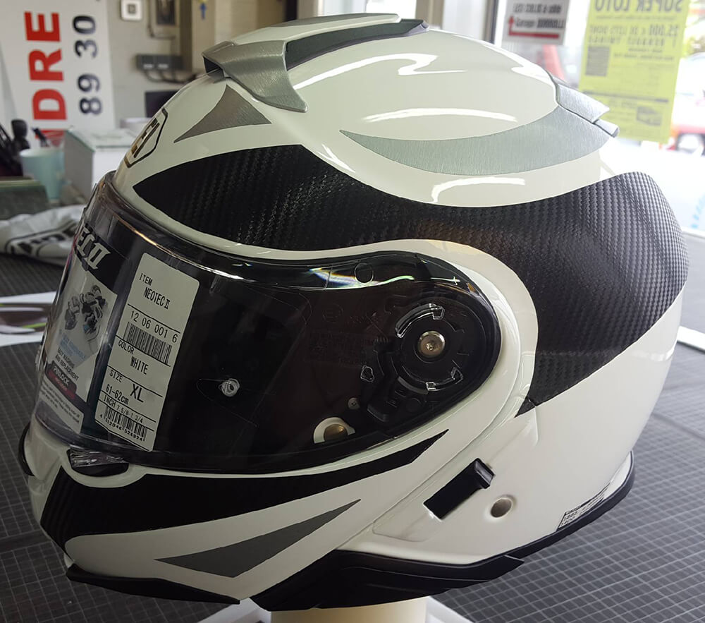 Personnalisation d’un casque de moto pour un particulier avec décor adhésif effet carbone. Décor réalisé par nos soins.