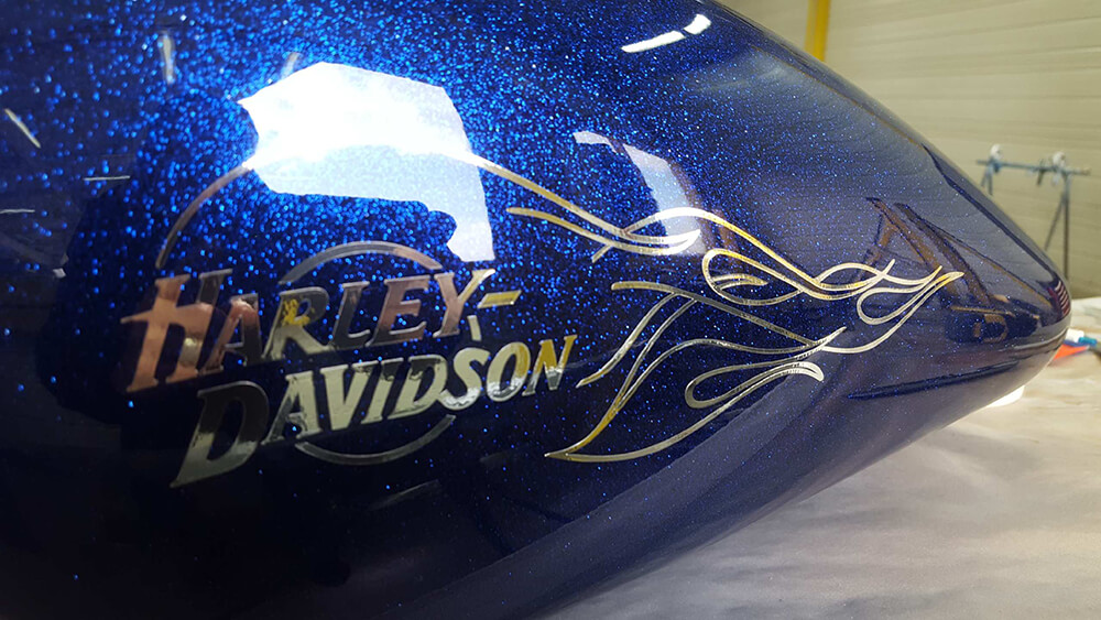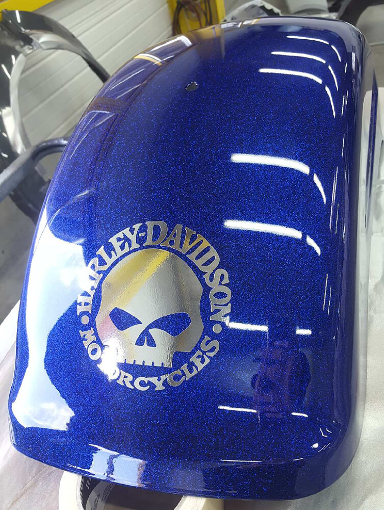 Personnalisation du réservoir et d’un garde-boue de moto pour un particulier passionné de Harley Davidson. Décor réalisé par nos soins.