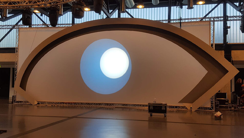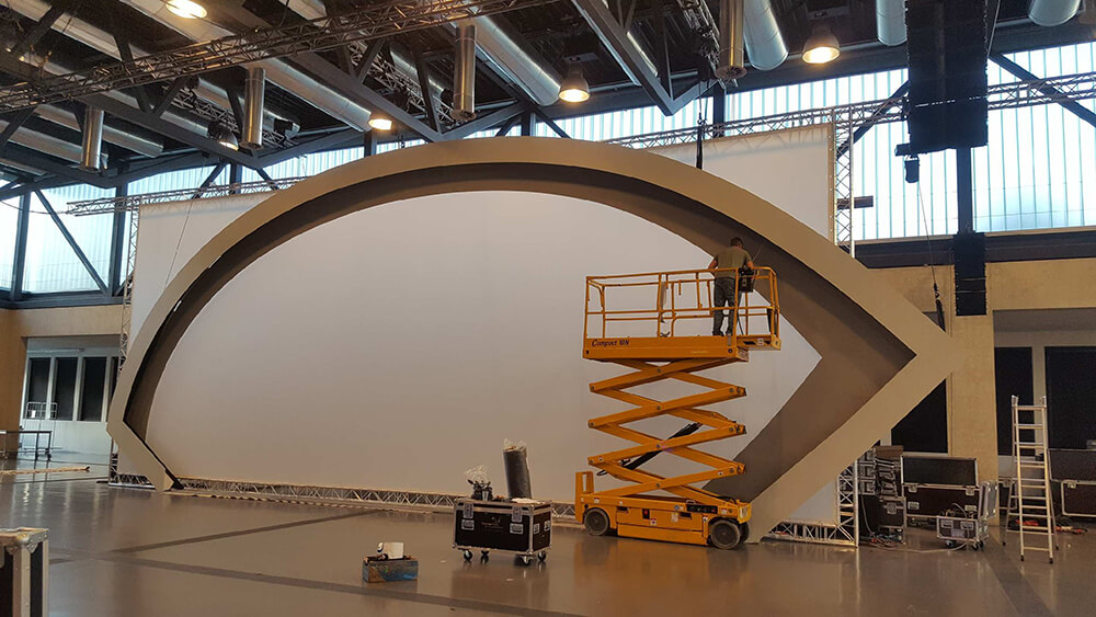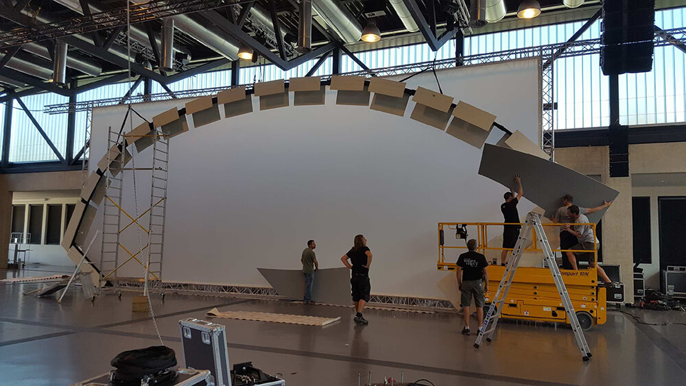 Création d’un décor adhésif permettant la projection d’animations vidéos sur le fond de scène d’une manifestation organisée par le Croix rouge Suisse. Décor réalisé par nos soins.