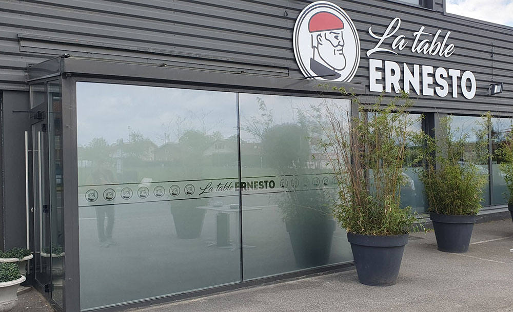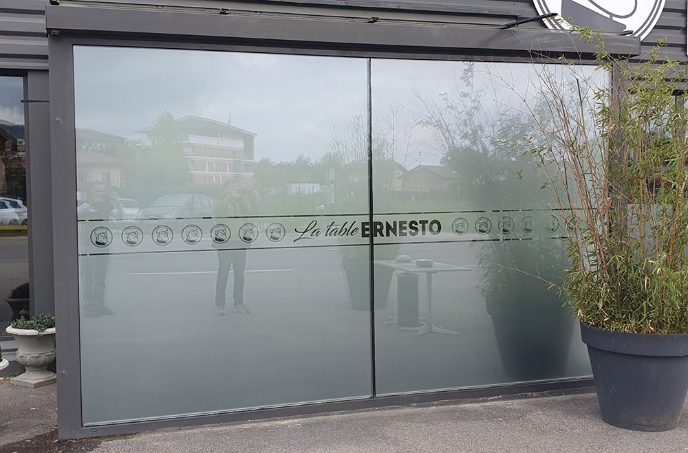 Mise en place d’un décor en adhésif dépoli avec découpes du logo pour ce nouveau restaurant qui vient d’ouvrir ses portes à Cranves-Sales. Décor réalisé par nos soins.