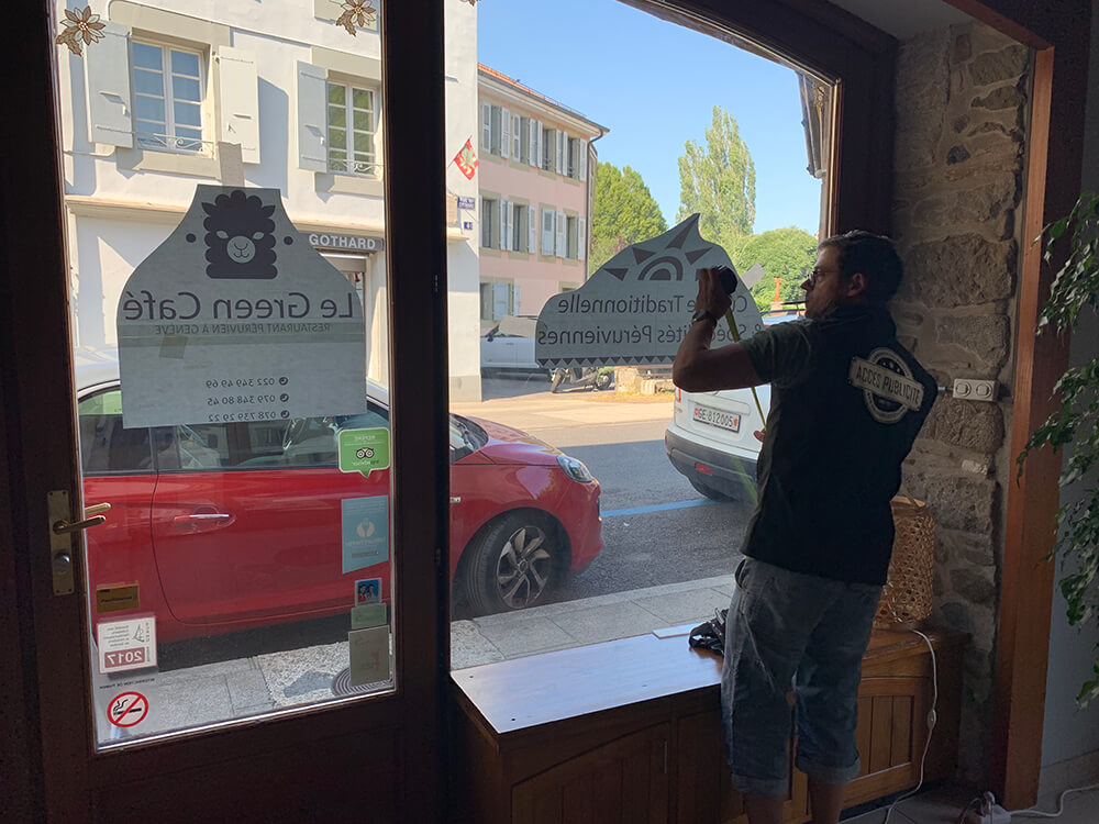 Décoration des vitrines de ce nouveau restaurant péruvien installé à Chêne Bourg (Suisse). Décor réalisé par notre partenaire graphique OAK-Webdesign.