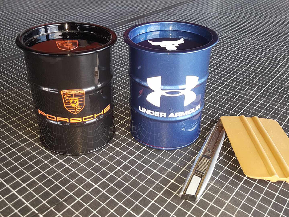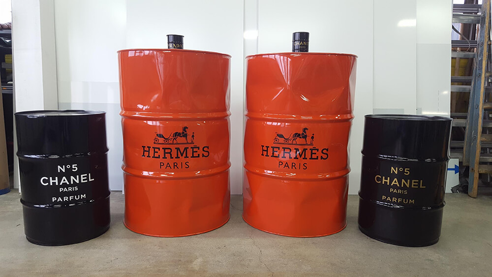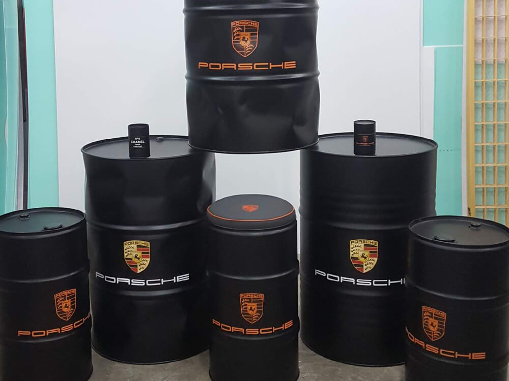 Personnalisation de barils transformés en éléments décoratifs et mobilier pour un garage automobile installé à Cranves-Sales. Décor réalisé par nos soins.