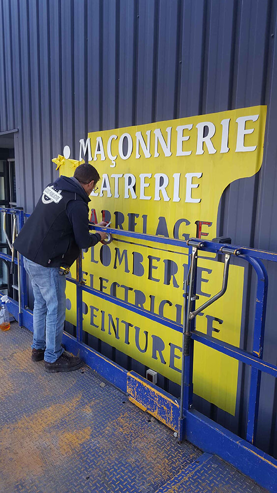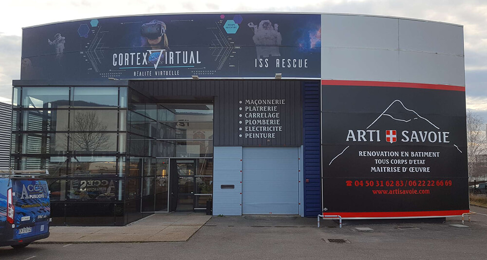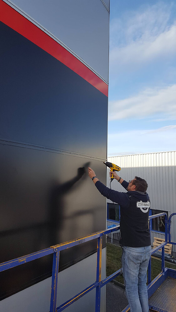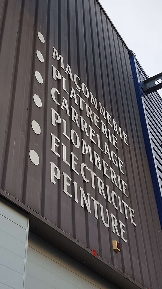Décoration des façades extérieures en adhésif teinté masse et lettres Dibond découpées des nouveaux locaux de l’entreprise Arti Savoie. Décor réalisé par nos soins.