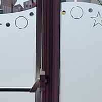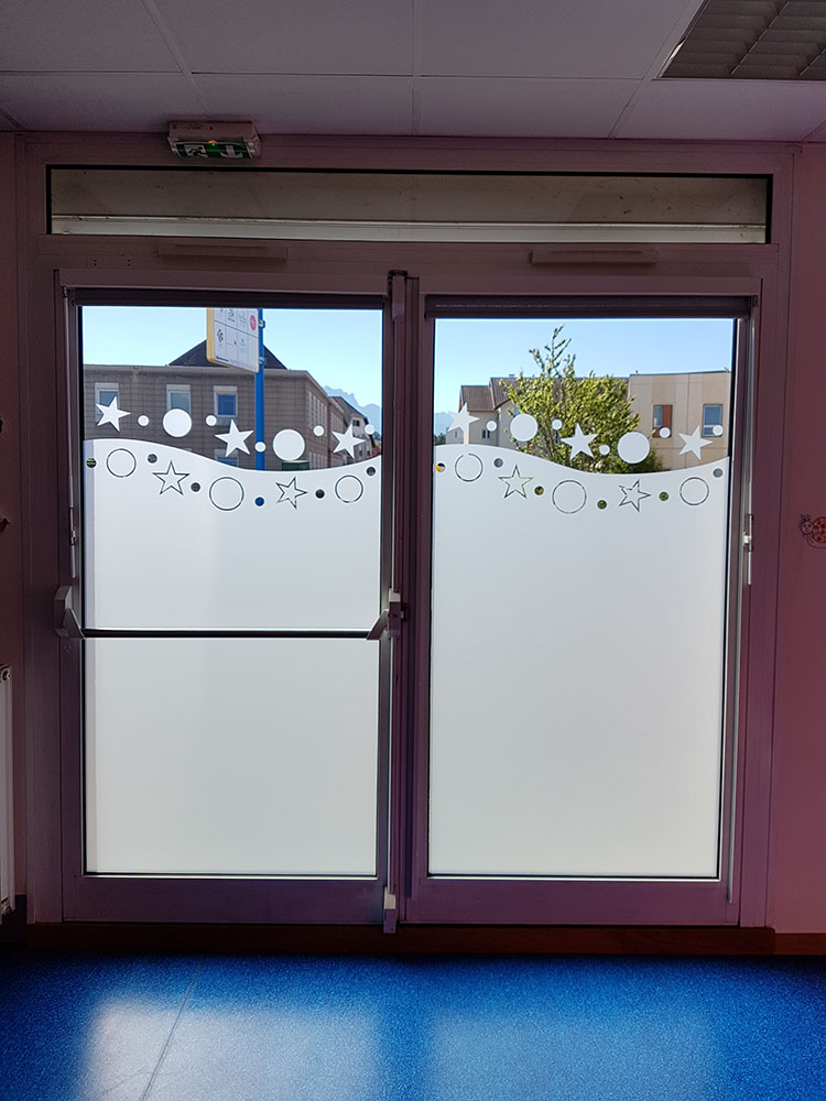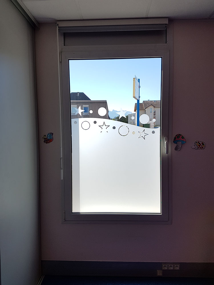 Création d’une décoration en adhésif dépoli pour une Crèche d’enfants handicapés. Ce type d’adhésif est idéal pour créer une ambiance intime tout en laissant passer la lumière.