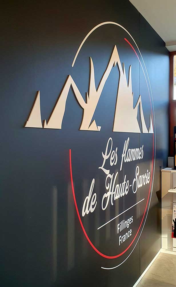 Fourniture et installation d’un logo XXL combinant décors adhésifs en teinte masse et éléments en Forex 3mm pour un effet en relief, réalisé pour les Flammes de Haute-Savoie. Décors conçus par notre partenaire graphique OAK-Webdesign.