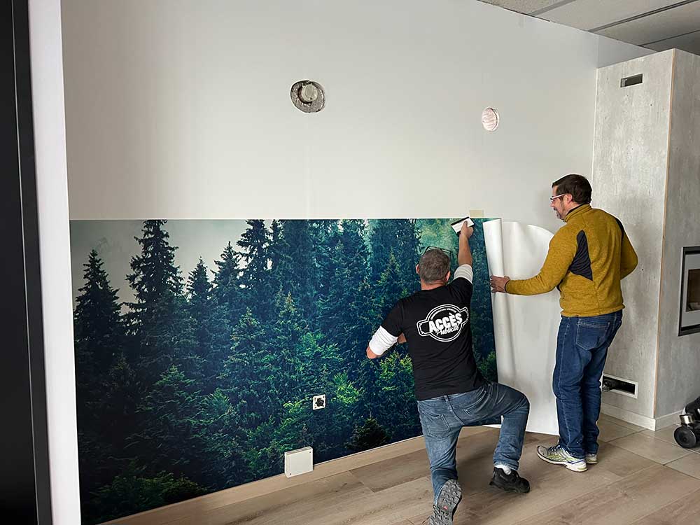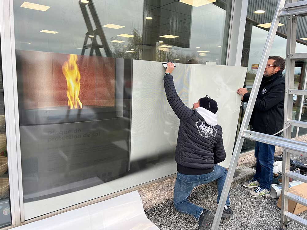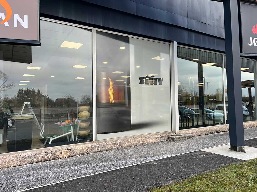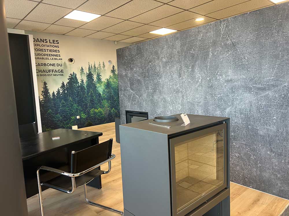 Mise en place de décors adhésifs afin de créer une nouvelle ambiance et de communiquer sur l’intégration d’une nouvelle marque chez un spécialiste en chaleur bois. Décors réalisés par notre partenaire graphique OAK-Webdesign.