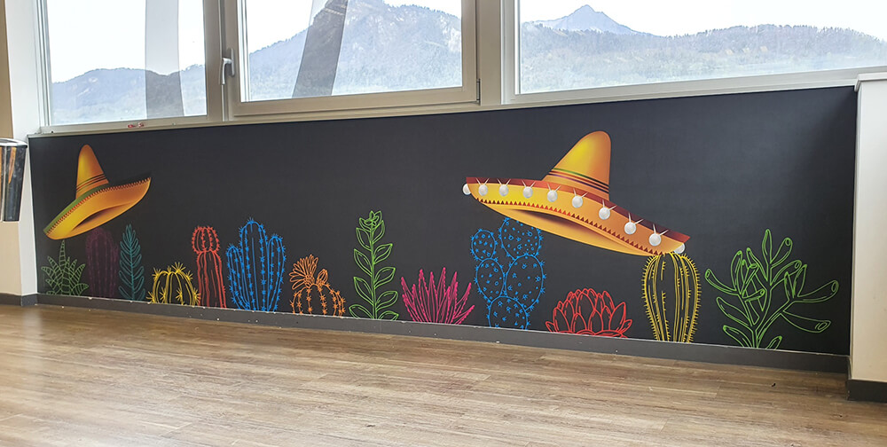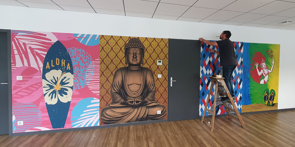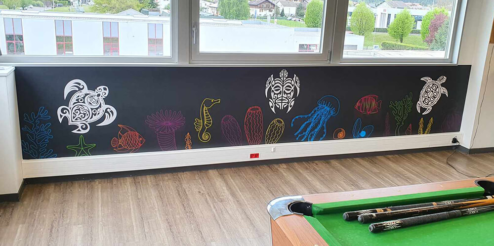 Fourniture et installation de décors adhésifs dans la salle de pause d’une entreprise de décolletage. Décors fournis par l’entreprise.