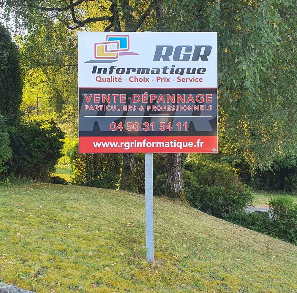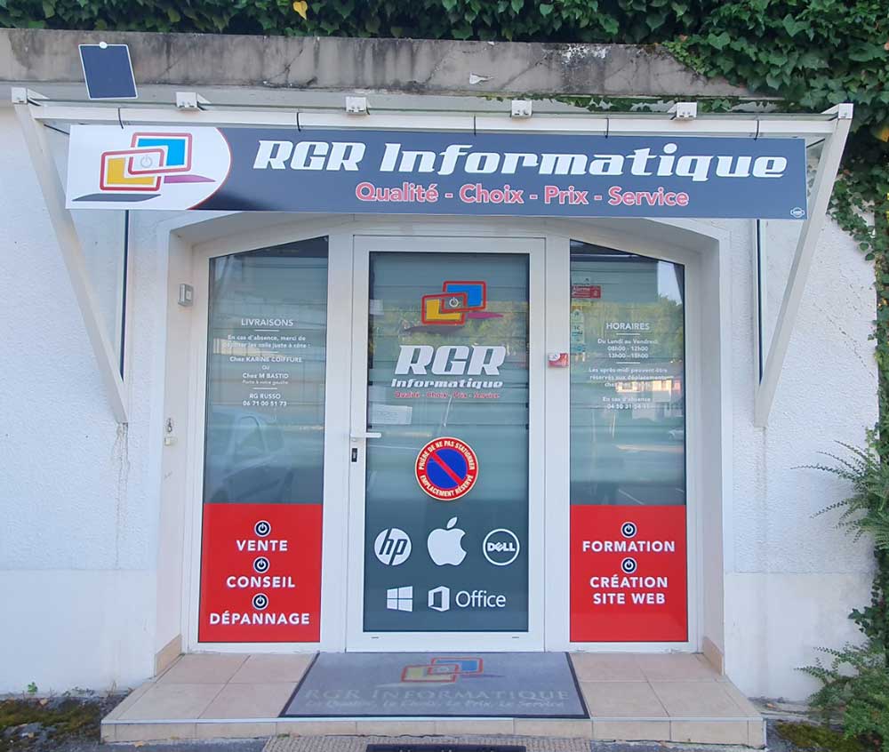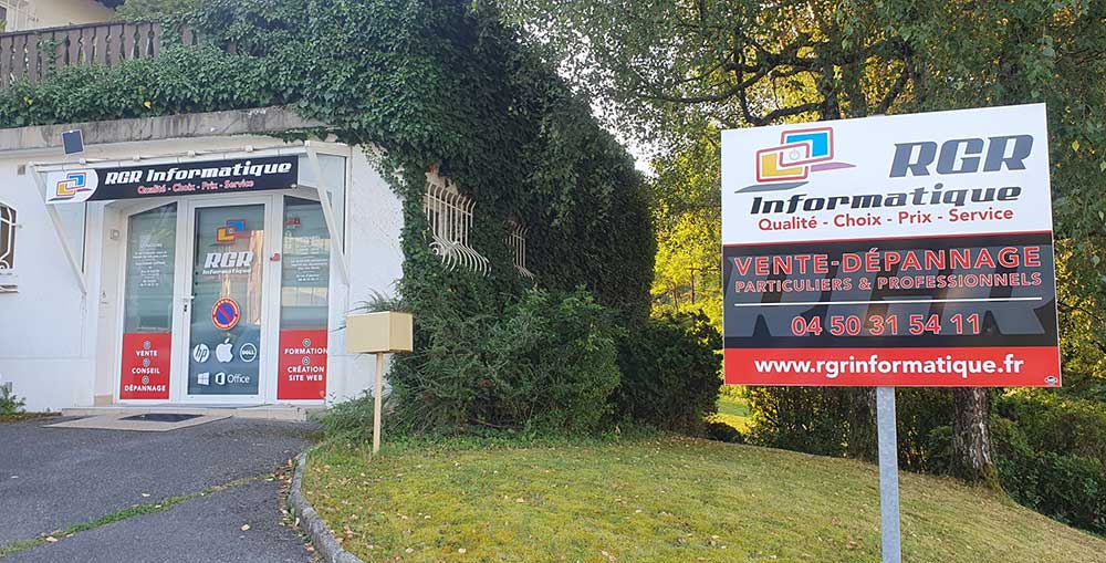 Mise en place de décors adhésifs sur les vitrines, l’enseigne et le panneau d’affichage de cette entreprise d’informatique installé à Fillinges. Décor réalisé par notre partenaire graphique OAK-Webdesign.