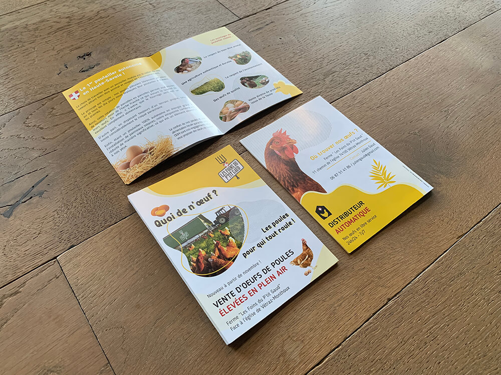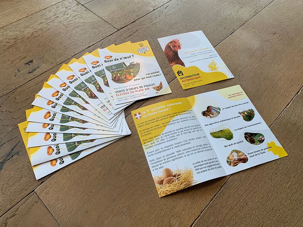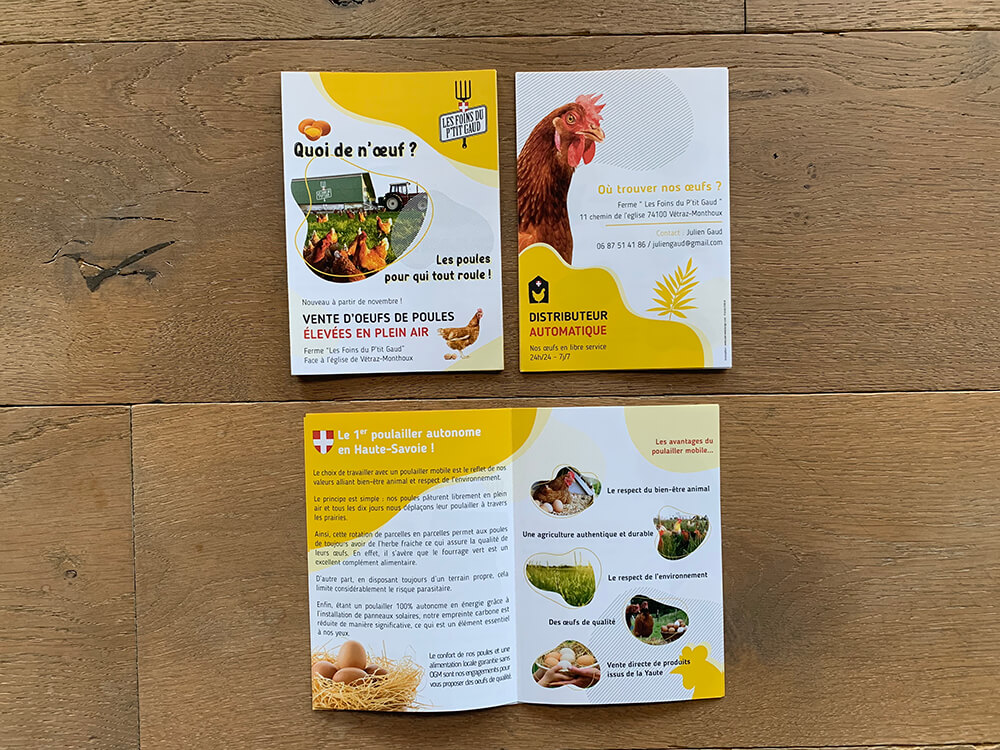 Création des dépliants publicitaires de l’exploitation agricole les foins du p’tit Gaud permettant de faire la promotion d’un nouveau service de vente d’œufs frais. Supports de communication imprimés par nos soins & création graphique réalisée par notre partenaire OAK-Webdesign.