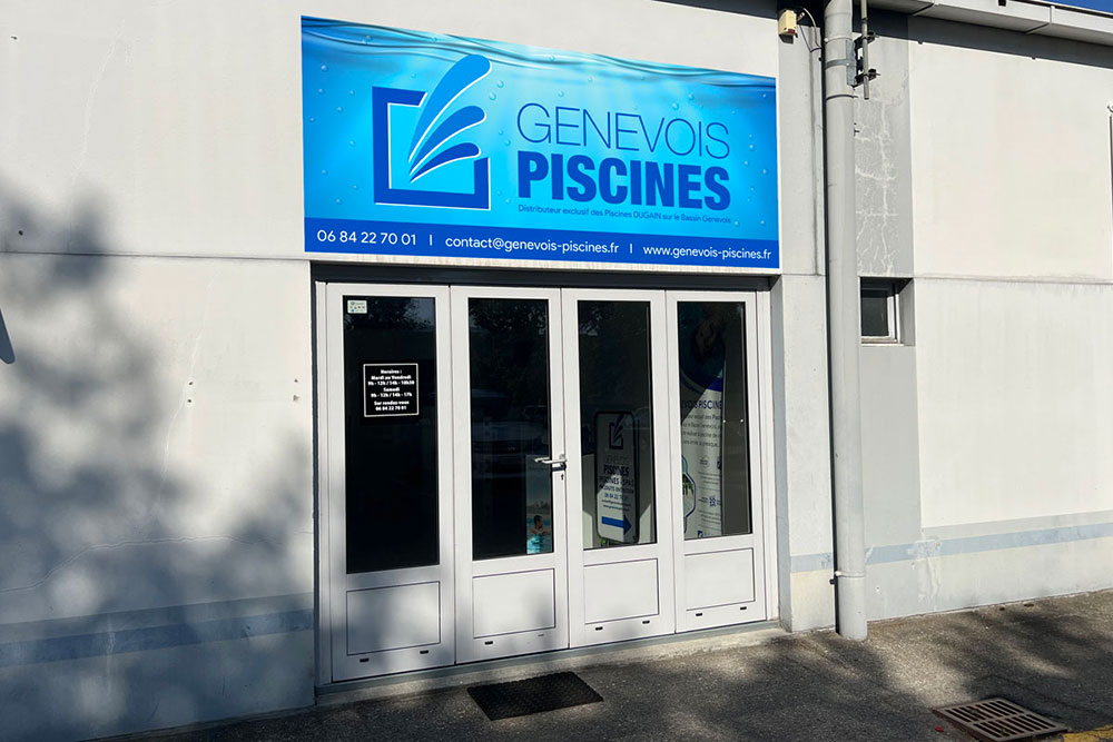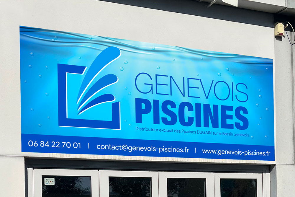 Fourniture d’une enseigne en Alu dibond avec décor adhésif pour un pisciniste installé à Ville la Grand. Décor réalisé par notre partenaire graphique OAK-Webdesign.