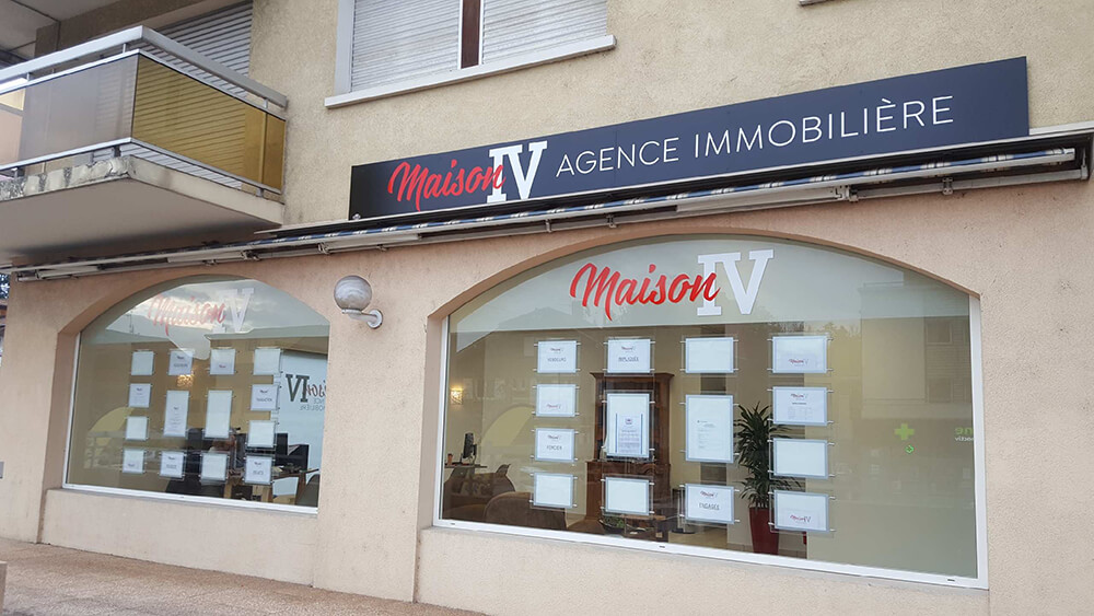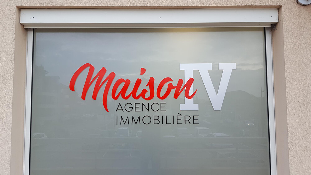 Création d’une enseigne en Alu Dibond et marquage en adhésifs dépolis des vitrines de cette nouvelle agence immobilière de Bonne. Décor réalisé par nos soins.