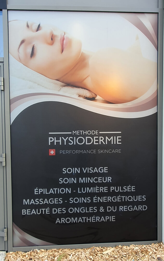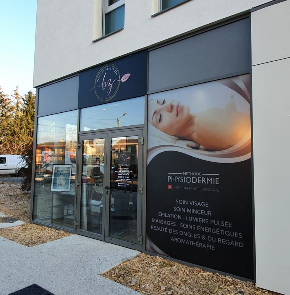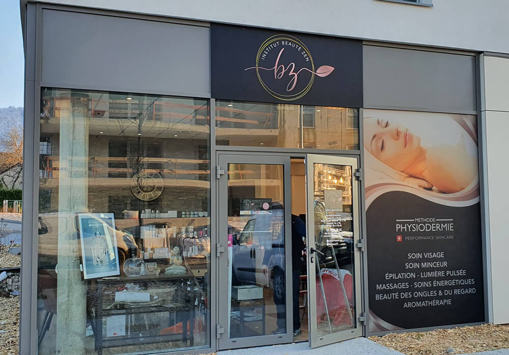 Mise en place d’une enseigne en panneau Alu Dibond et de décors adhésifs sur les vitrines de ce nouvel institut de beauté installé à Bons-en-Chablais.