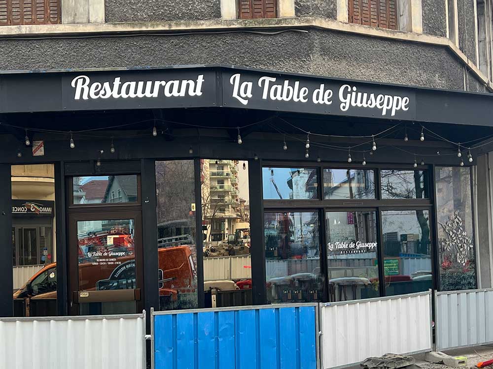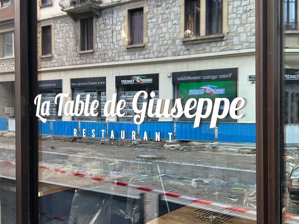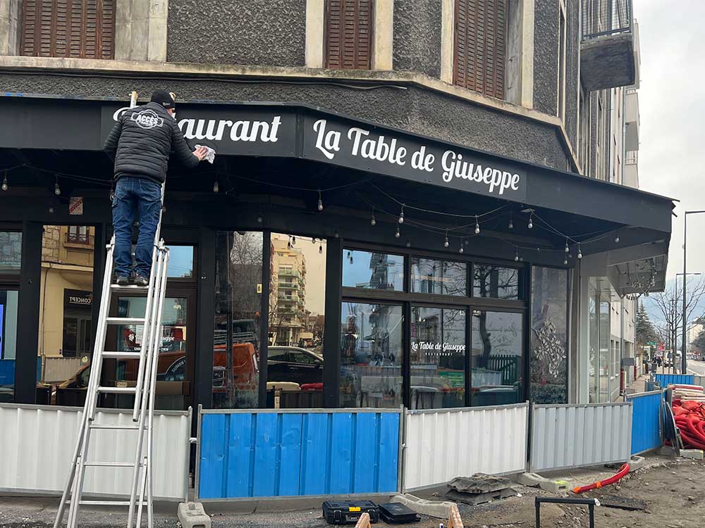 Installation d’une pré-enseigne en panneaux Alu Dibond et marquage des vitrines pour un restaurateur annemassien, en collaboration avec notre partenaire créatif OAK-Webdesign.
